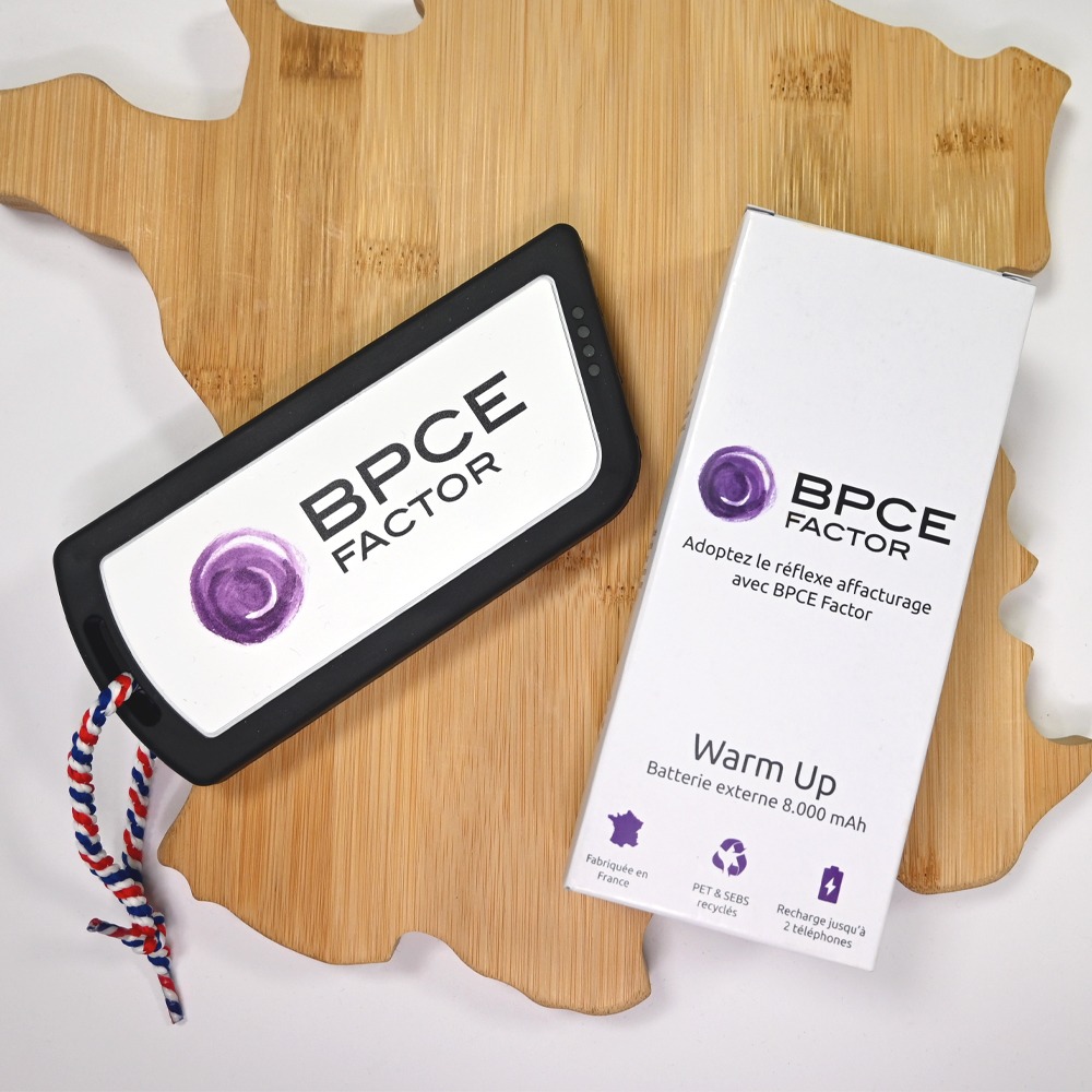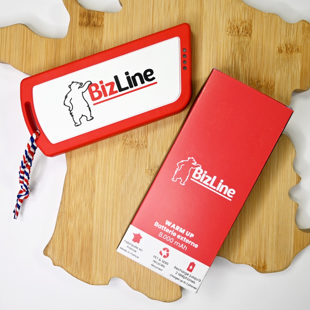 Warm Up est une batterie externe écologique de 8000mAh avec charge rapide 15W, entièrement fabriquée en France en matériaux recyclés (PET + SEBS). Dotée de connecteurs USB-C et USB-A, elle recharge 2 smartphones simultanément et se personnalise facilement pour vos événements d’entreprise, salons ou cadeaux clients. Compacte (200g), certifiée RoHS/CE/FSC, elle combine performance, durabilité et engagement écologique.