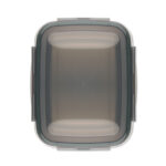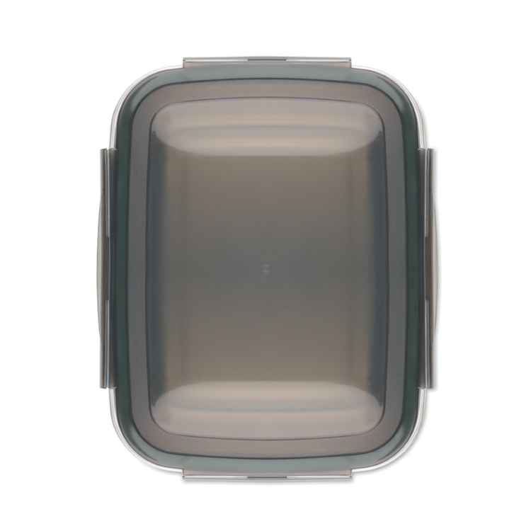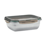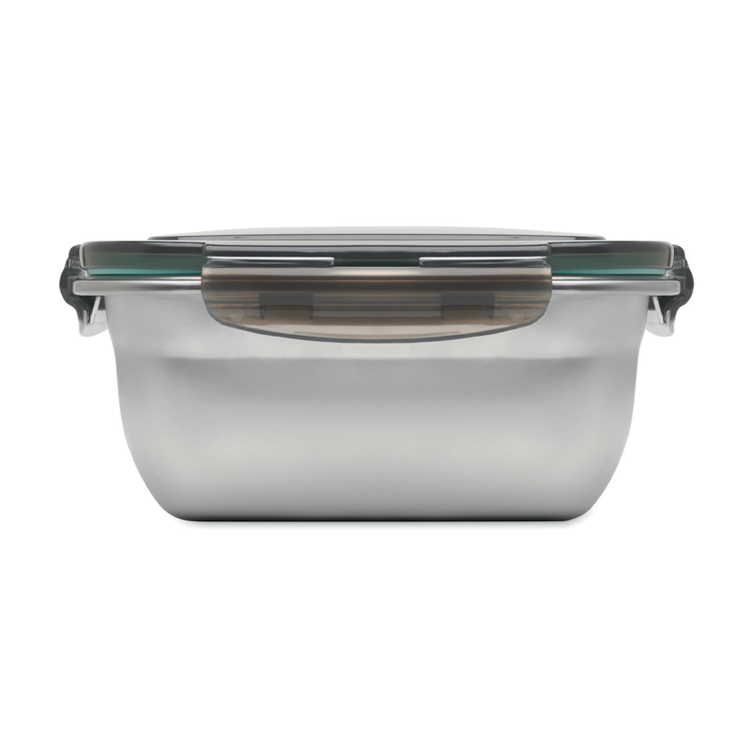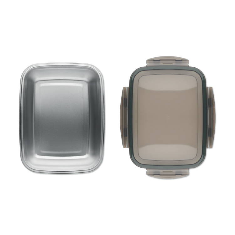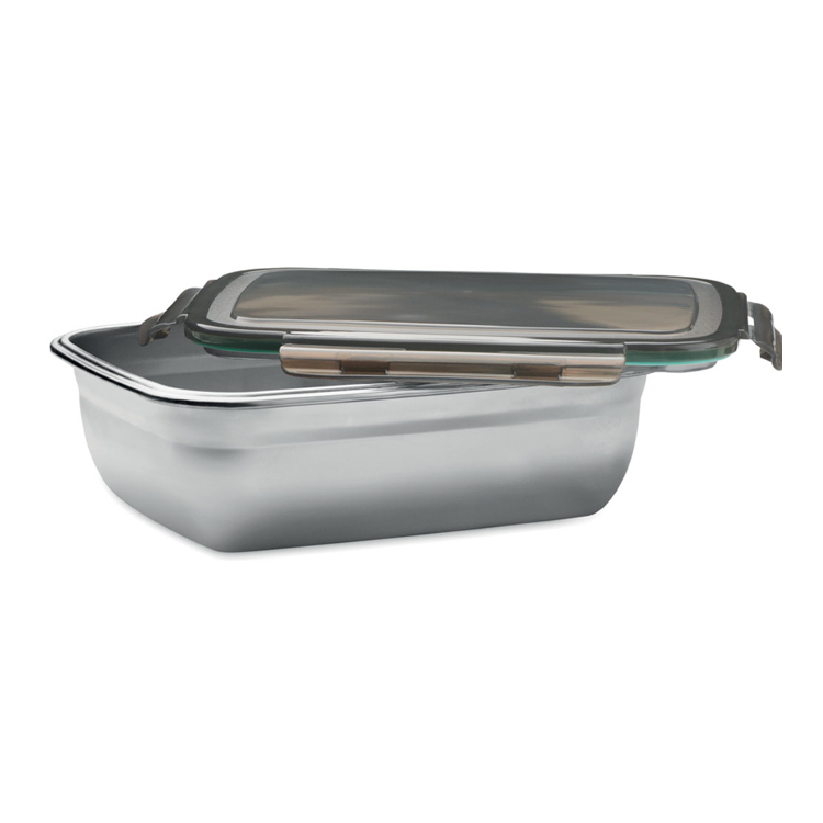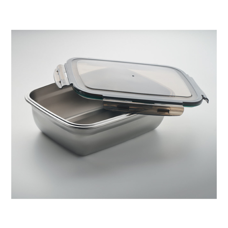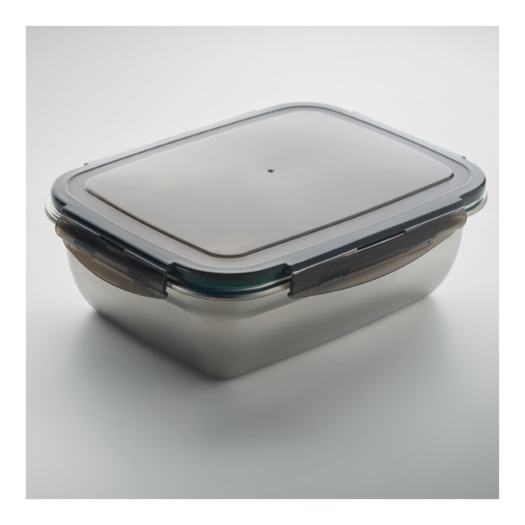 Boîte à lunch en acier inoxydable recyclé avec couvercle en PP, fermeture à 4 fermoirs latéraux et séparateur interne. Contenance de 1500 ml, dimensions 22,5 x 17 x 7,6 cm, poids 0,473 kg. Personnalisation par gravure laser (80 x 15 mm) ou tampographie 1 couleur (100 x 60 mm).