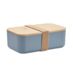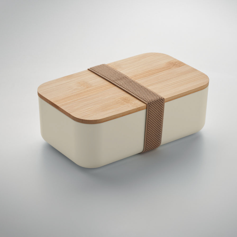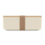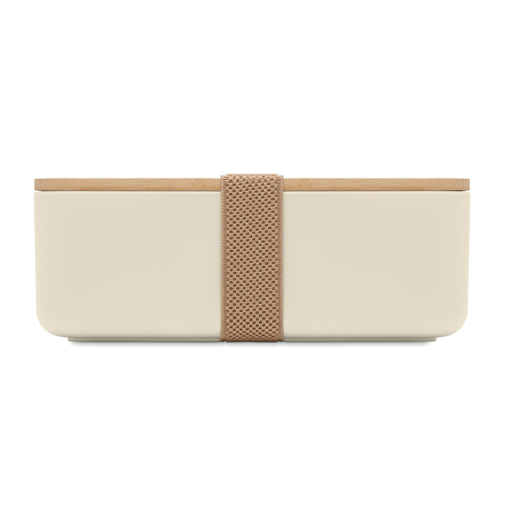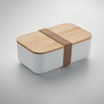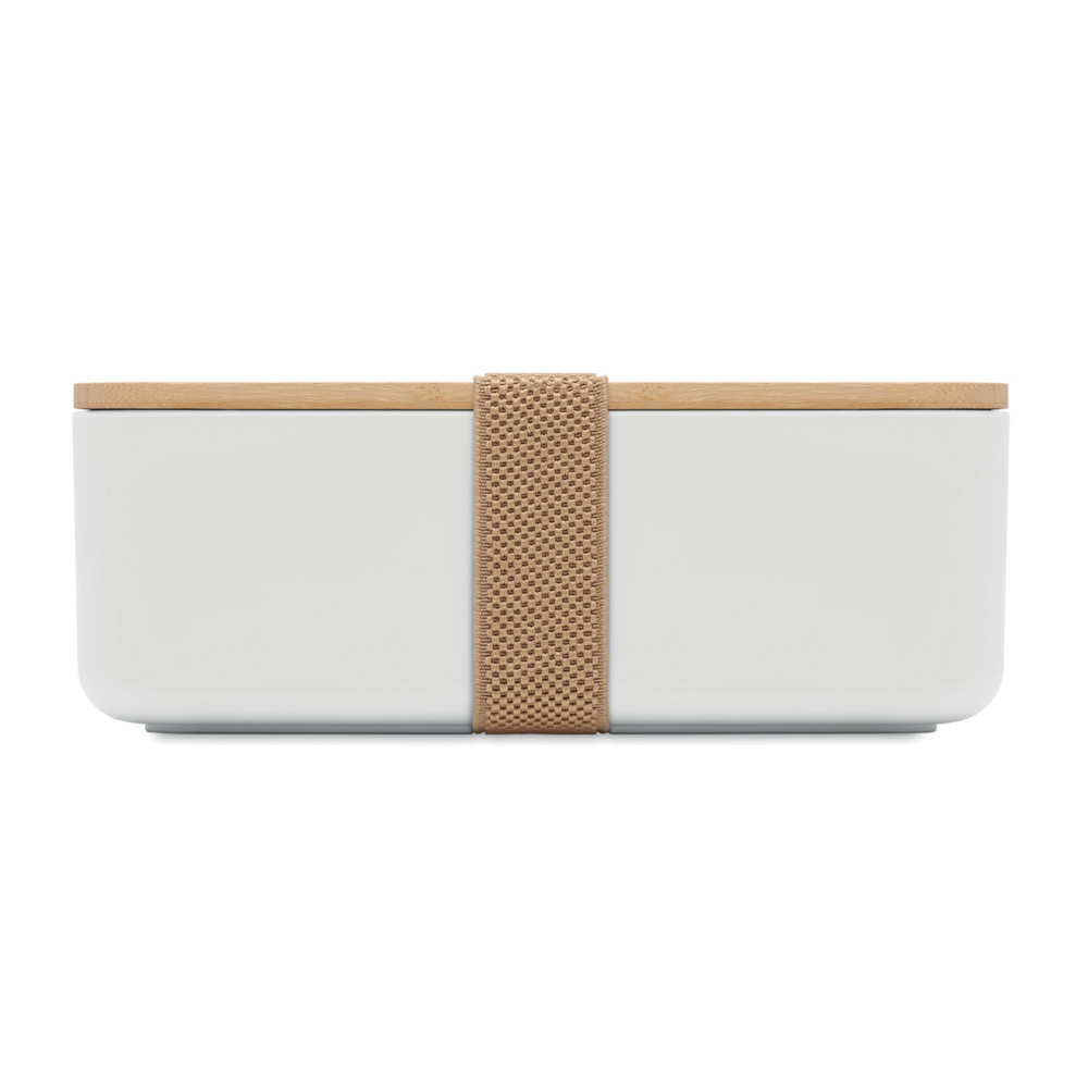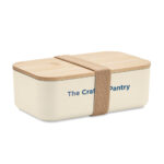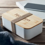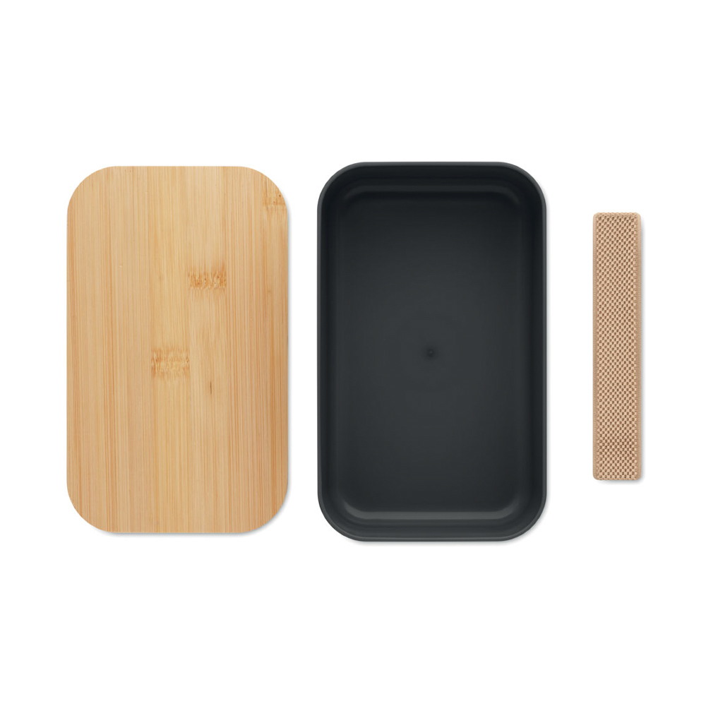 Boîte à lunch en maïs 100% PLA avec couvercle en bambou, contenance de 1000 ml, dimensions 19 x 12 x 6,5 cm, poids 0,45 kg. Fermeture par élastique en RPET. Personnalisation par gravure laser (149 x 100 mm) ou tampographie 1 couleur sur le couvercle (80 x 40 mm) ou sur le corps (80 x 40 mm).