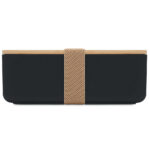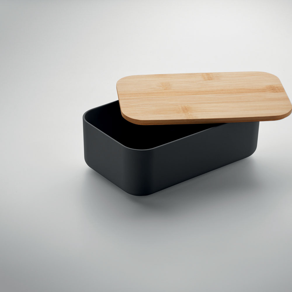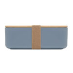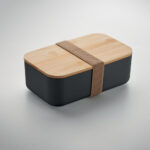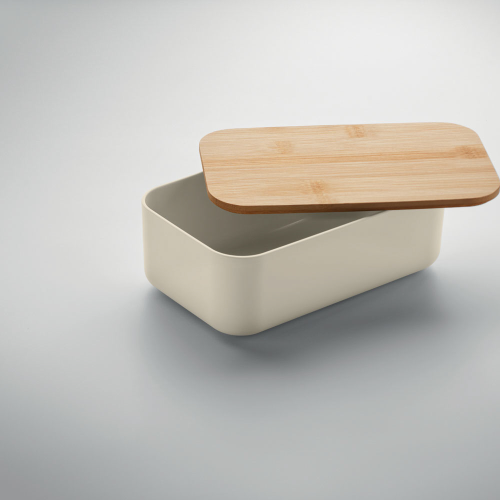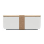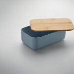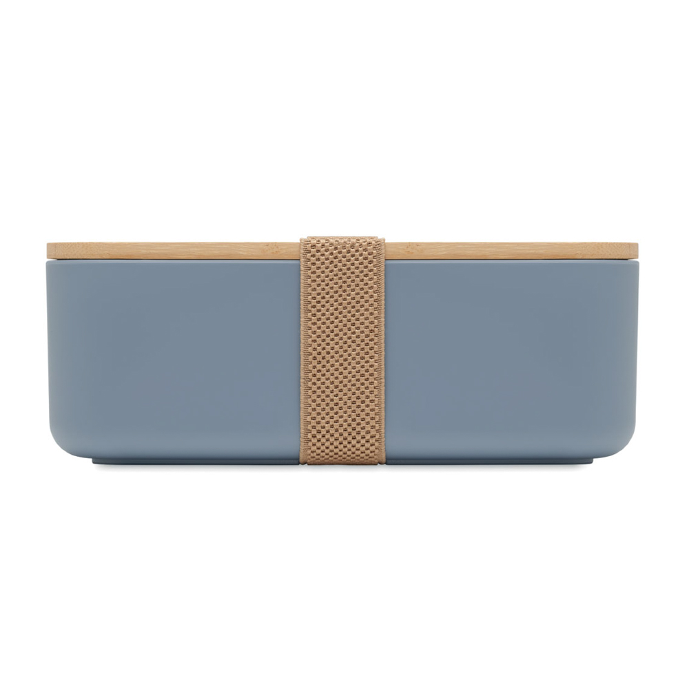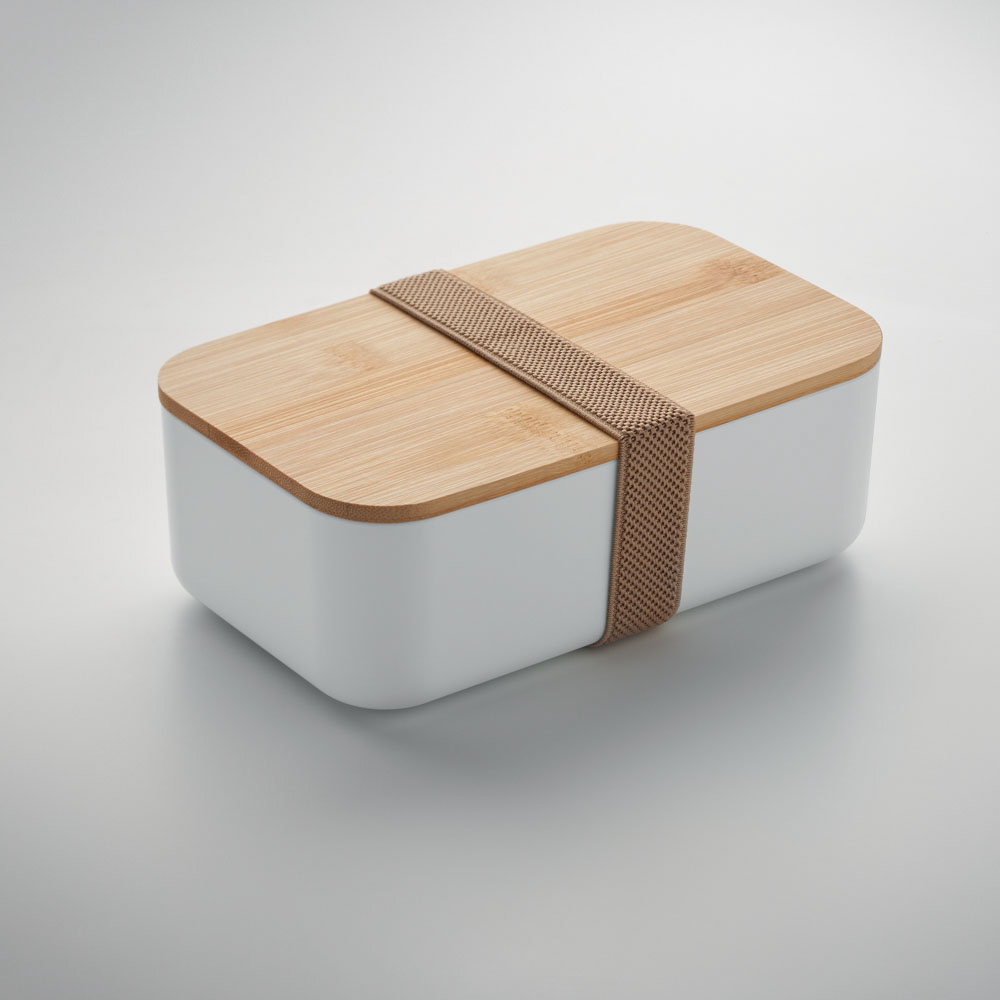 Boîte à lunch en maïs 100% PLA avec couvercle en bambou, contenance de 1000 ml, dimensions 19 x 12 x 6,5 cm, poids 0,45 kg. Fermeture par élastique en RPET. Personnalisation par gravure laser (149 x 100 mm) ou tampographie 1 couleur sur le couvercle (80 x 40 mm) ou sur le corps (80 x 40 mm).