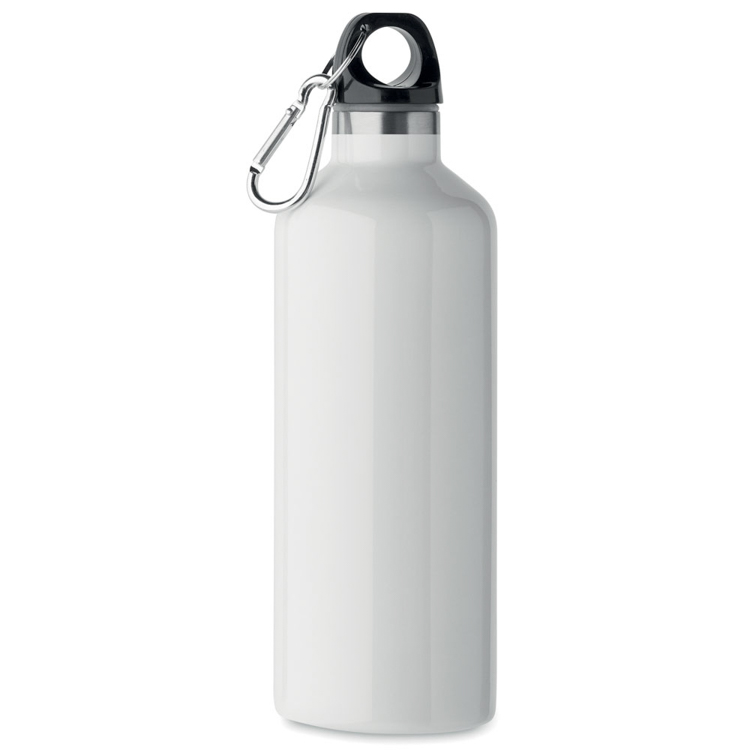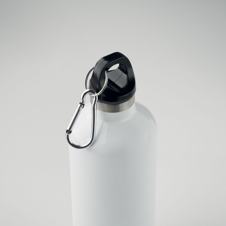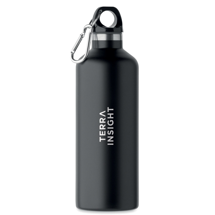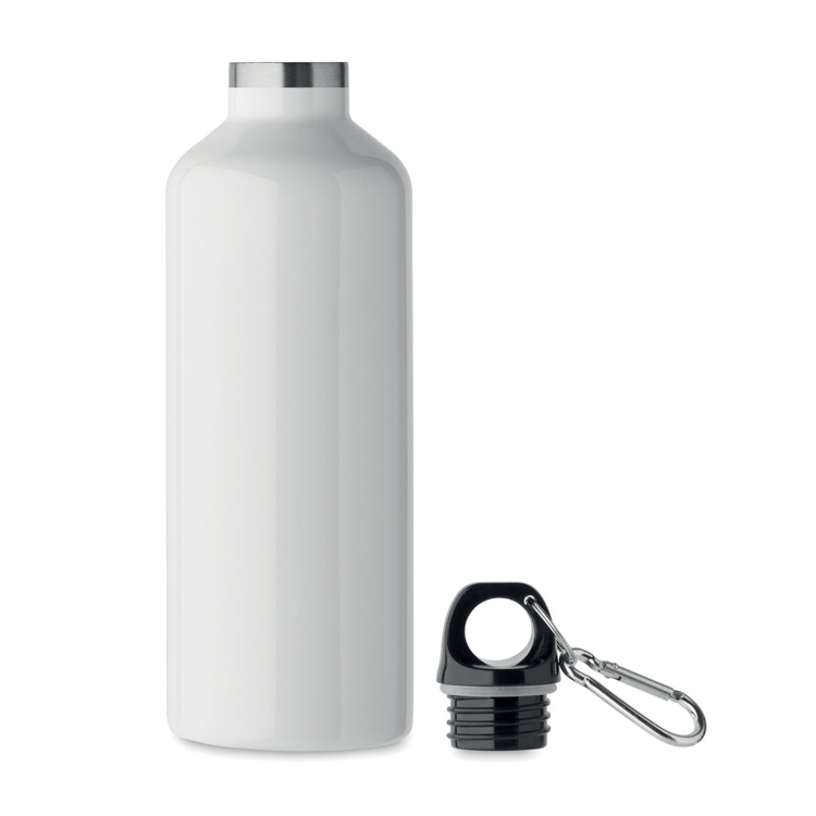 Bouteille isotherme à double paroi en acier inoxydable recyclé, étanche et isotherme, avec couvercle à poignée mousqueton. Contenance 500 ml. Dimensions 7 x 7 x 23 cm, poids 0,27 kg. Disponible en blanc et noir. Personnalisation possible par gravure laser, gravure laser 360°, impression numérique 360° ou sérigraphie circulaire.