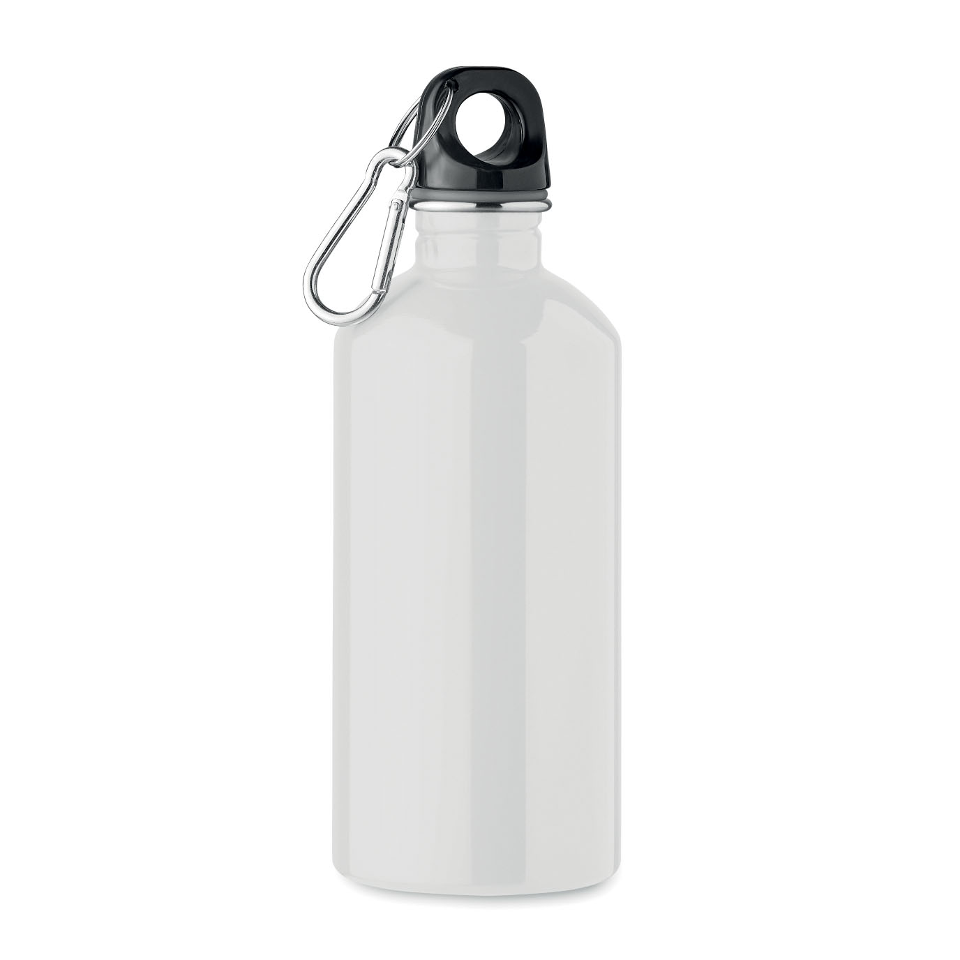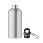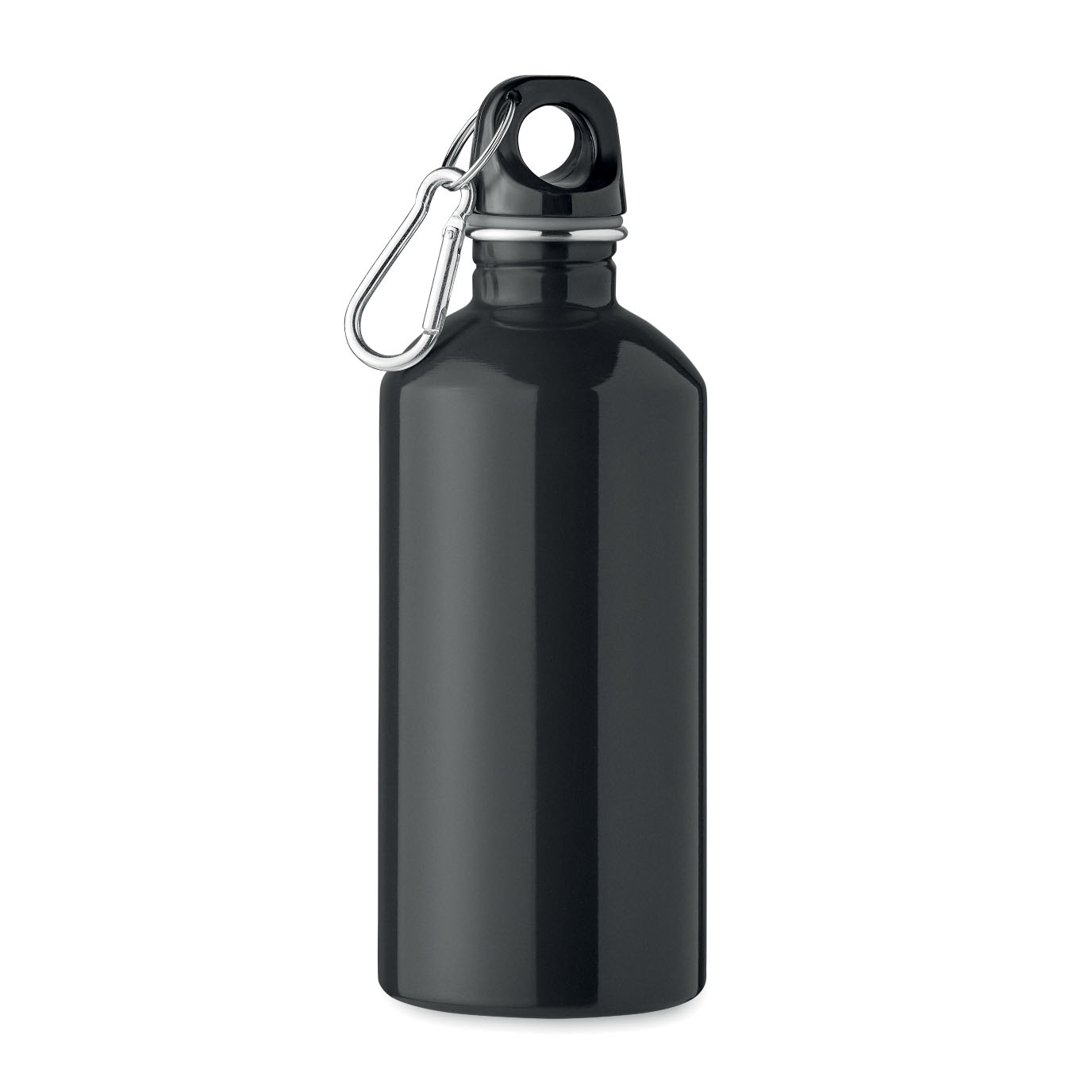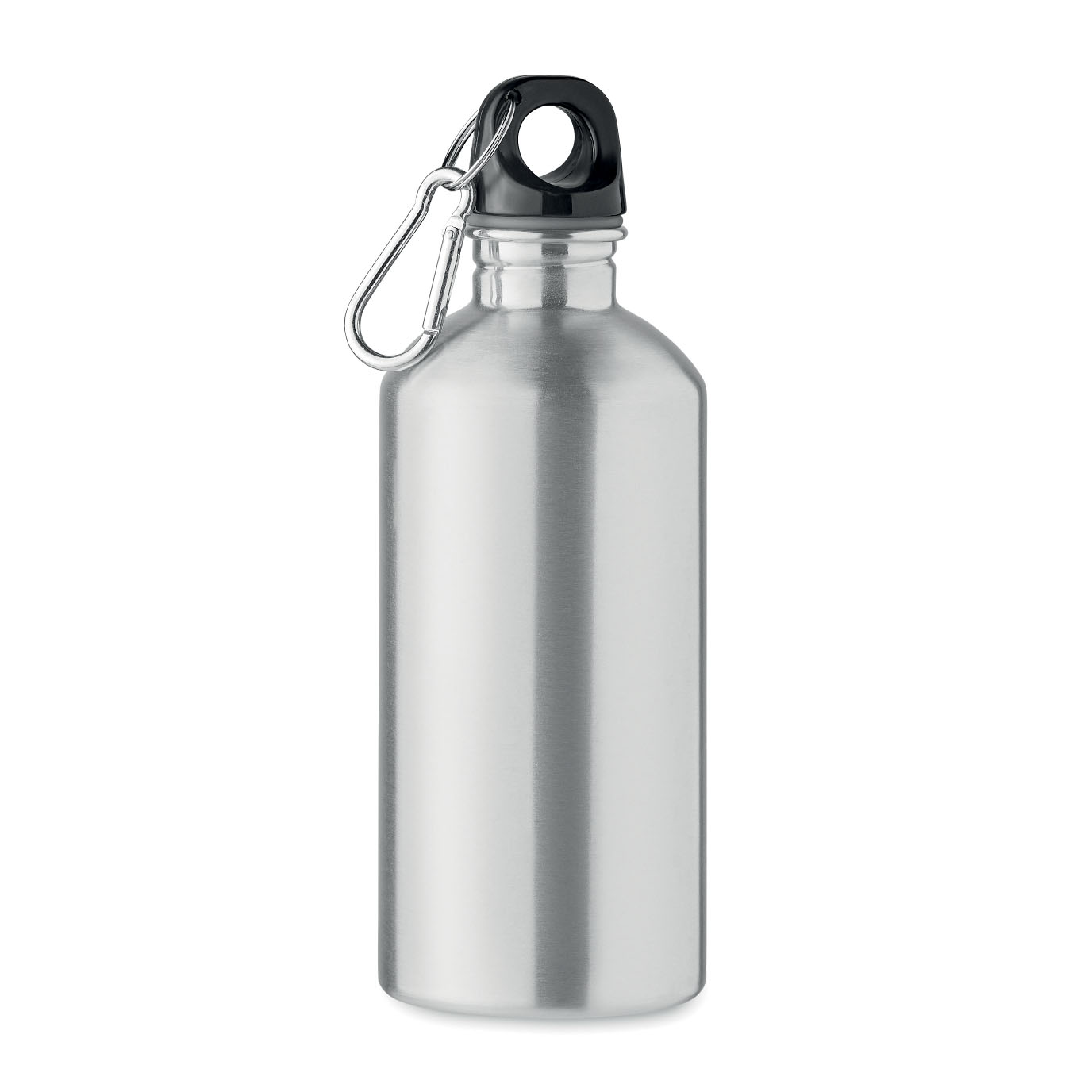 Bouteille monocouche en acier inoxydable recyclé avec mousqueton, contenance 500 ml / 50 cl, dimensions 6,5 x 6,5 x 19 cm, poids 0,124 kg, équipée d’un corps étanche et compatible lave-vaisselle, disponible en plusieurs couleurs et personnalisable par gravure laser, gravure laser 360° ou impression numérique 360° (quadri), avec zones de marquage dédiées, également proposée sans personnalisation pour un usage en goodies tendance, cadeau commercial ou cadeaux collaborateurs.