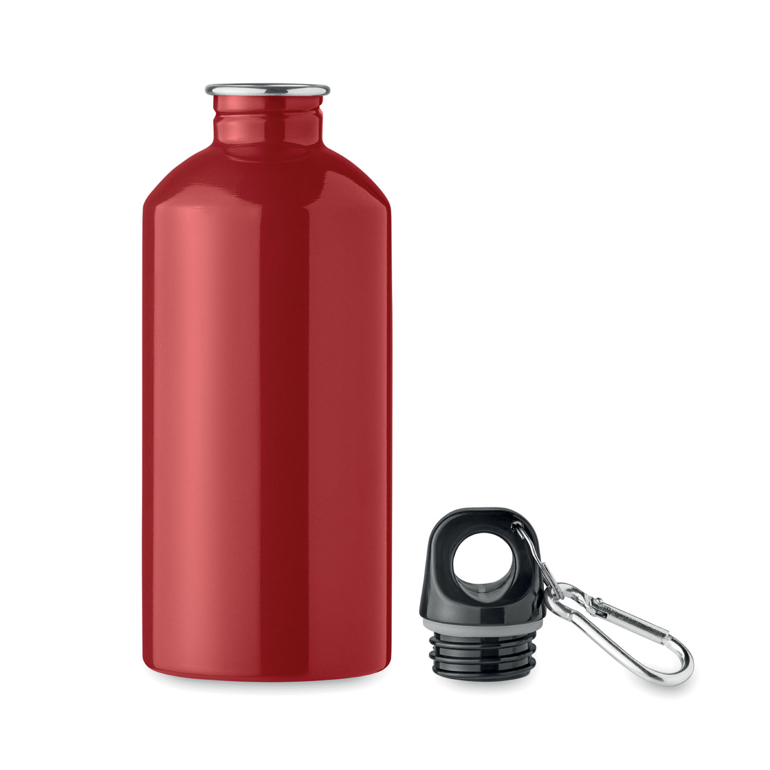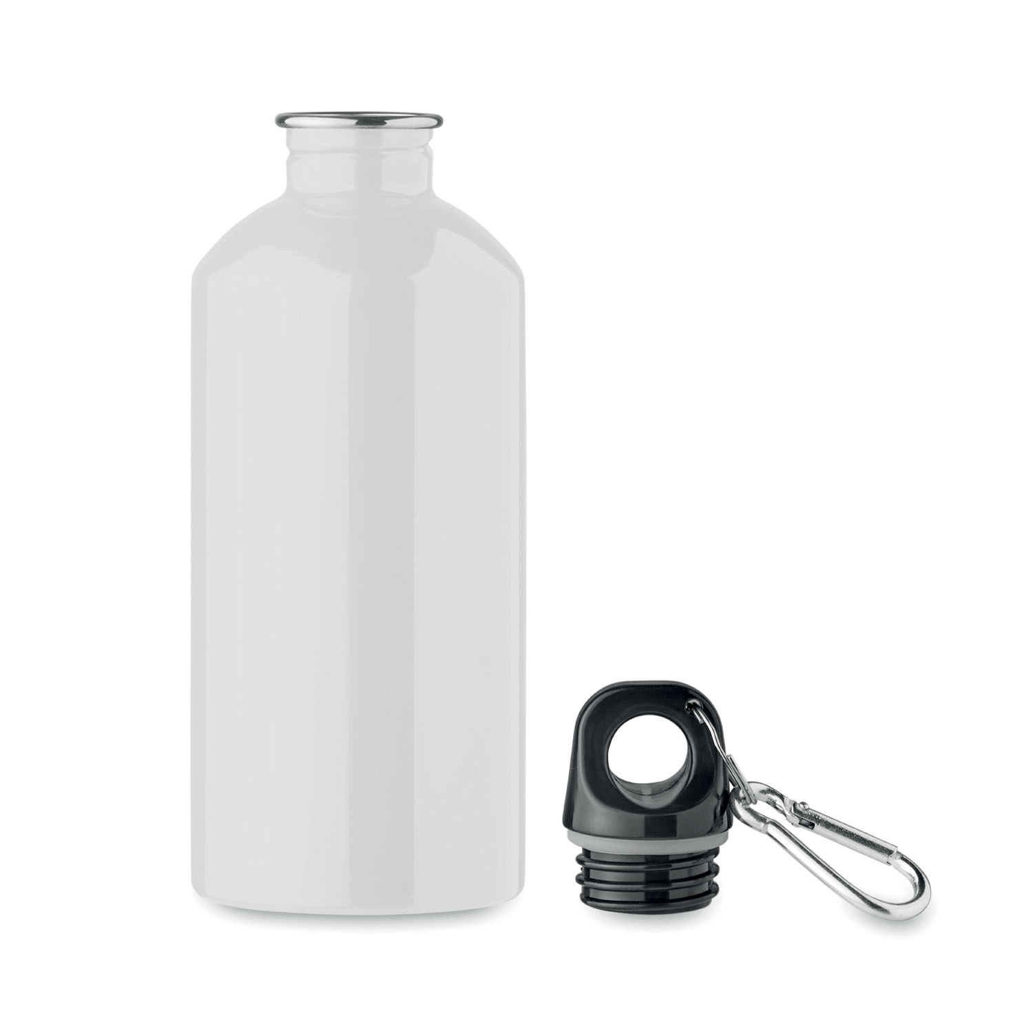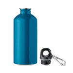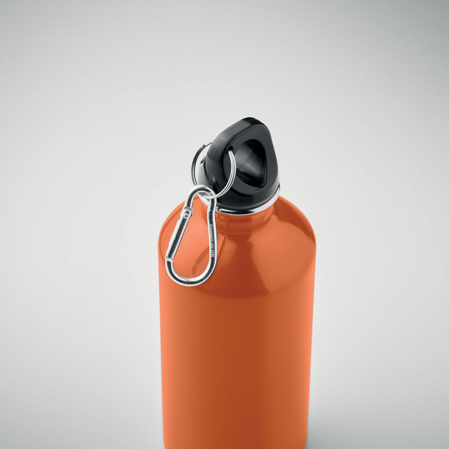 Bouteille monocouche en acier inoxydable recyclé avec mousqueton, contenance 500 ml / 50 cl, dimensions 6,5 x 6,5 x 19 cm, poids 0,124 kg, équipée d’un corps étanche et compatible lave-vaisselle, disponible en plusieurs couleurs et personnalisable par gravure laser, gravure laser 360° ou impression numérique 360° (quadri), avec zones de marquage dédiées, également proposée sans personnalisation pour un usage en goodies tendance, cadeau commercial ou cadeaux collaborateurs.