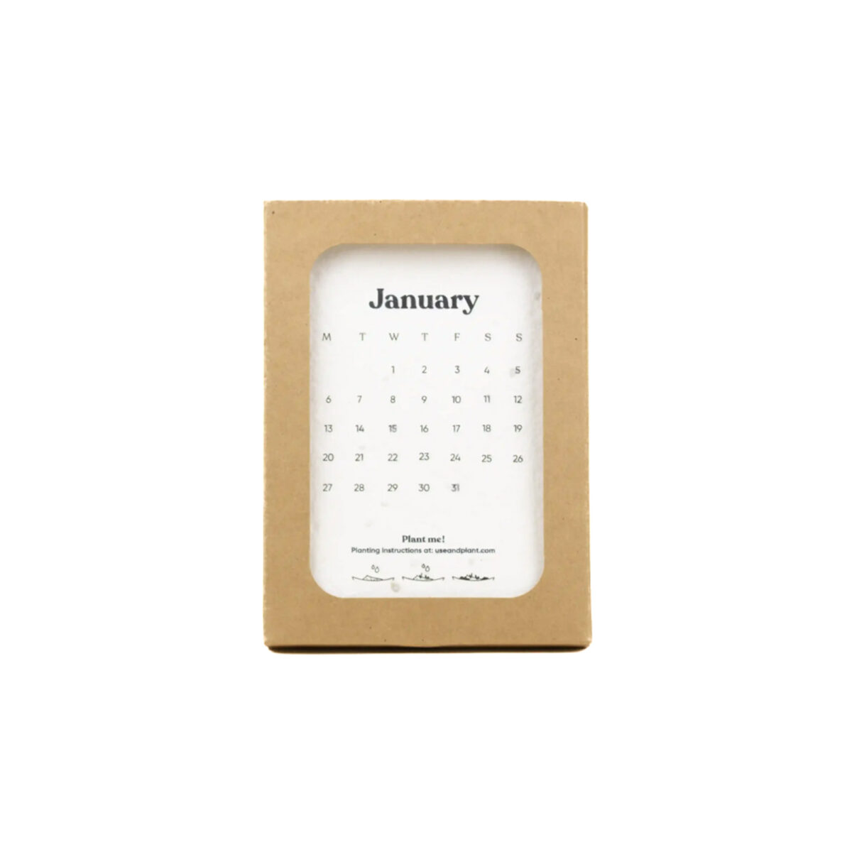 Calendrier A6 en papier ensemencé 250g, avec étui en carton FSC kraft ou blanc. Contient 12 feuilles mensuelles plantables. Impression quadri sur la couverture et chaque page. Format 11 x 15 cm, poids 70 g.
