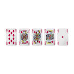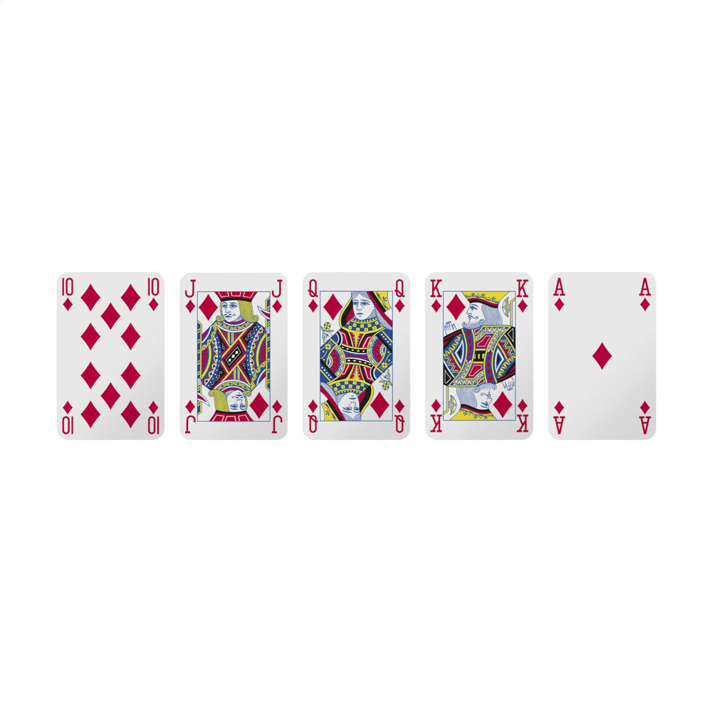 Cartes à jouer en carton de 300 g, format 8,7 x 5,6 cm, 52 cartes + 2 jokers. Impression quadri personnalisable au dos des cartes et sur la boîte. Zone de marquage : 48 x 79 mm (cartes), 174 x 176 mm (boîte).