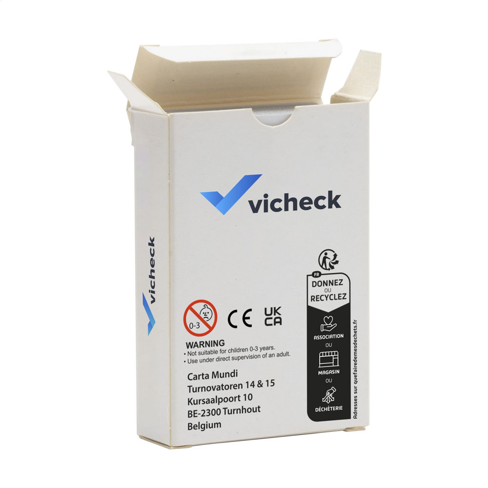 Ce jeu de cartes à jouer en carton personnalisable est composé de 52 cartes standards et de 2 jokers, le tout présenté dans une boîte en carton cellophanée. Chaque carte est fabriquée en carton robuste 300 g, garantissant une bonne tenue en main et une résistance à l’usage. Le jeu est entièrement personnalisable en impression numérique quadri au dos des cartes (zone 48 x 79 mm), ainsi que sur l’ensemble de la boîte (zone 174 x 176 mm), permettant de créer un objet de communication original et ludique.