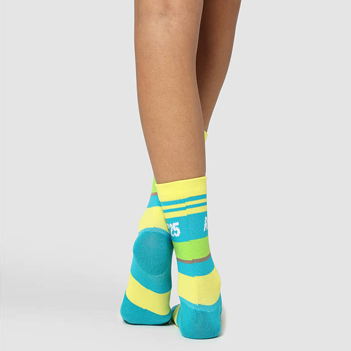 Les chaussettes de running personnalisables sont conçues pour une personnalisation intégrée directement dans le tricotage jacquard. Le visuel est tissé dans la maille, permettant une adaptation complète du motif selon le design défini lors de la fabrication.