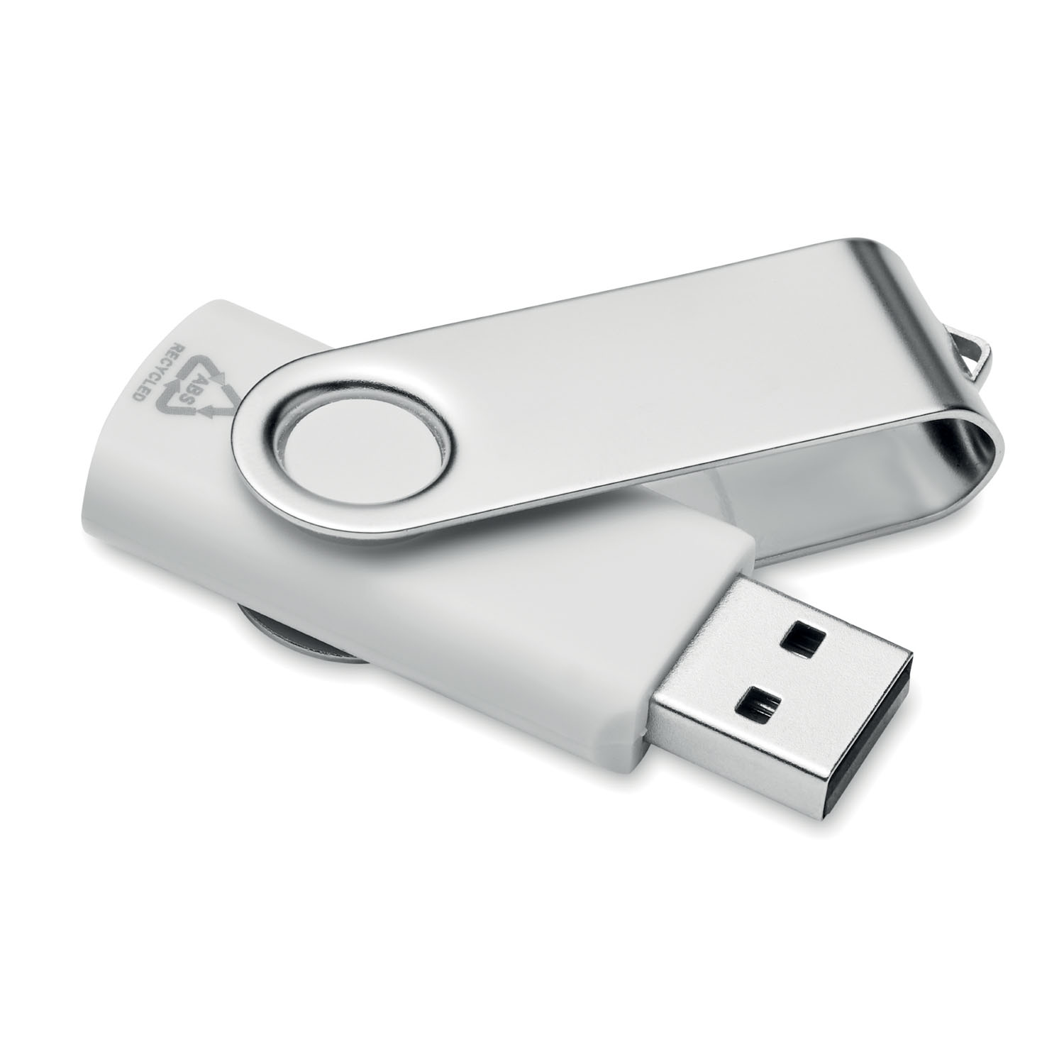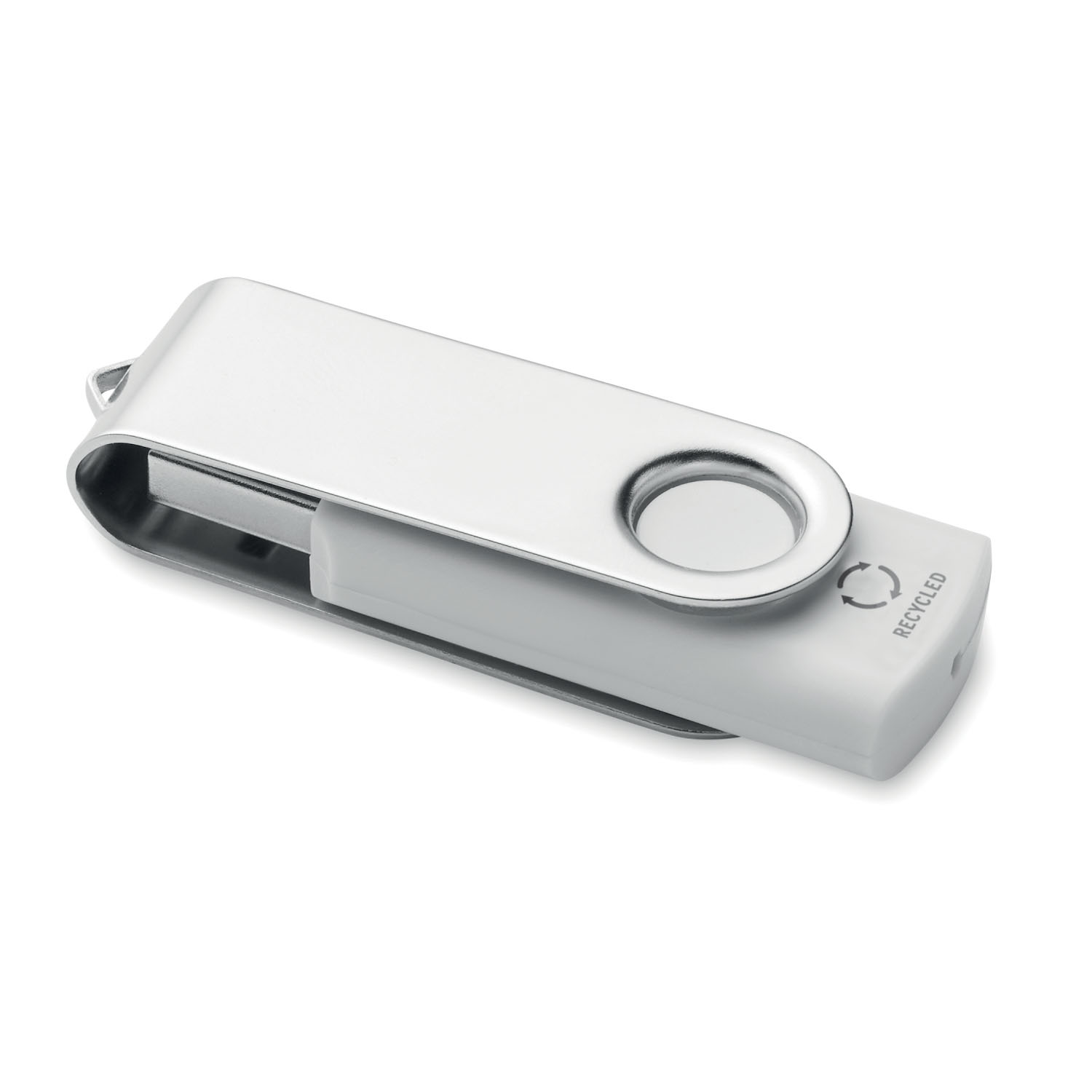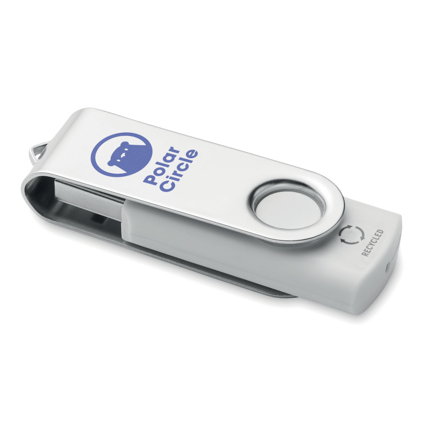 Clé USB 2.0 de 16 Go avec corps en ABS recyclé et finition blanche, munie d’un capot rotatif en métal pour connecter facilement au port USB. Dimensions 5,5 × 1,9 × 1 cm, poids 21 g. Personnalisation disponible en tampographie 1 ou 2 couleurs, gravure laser ou livraison sans personnalisation.