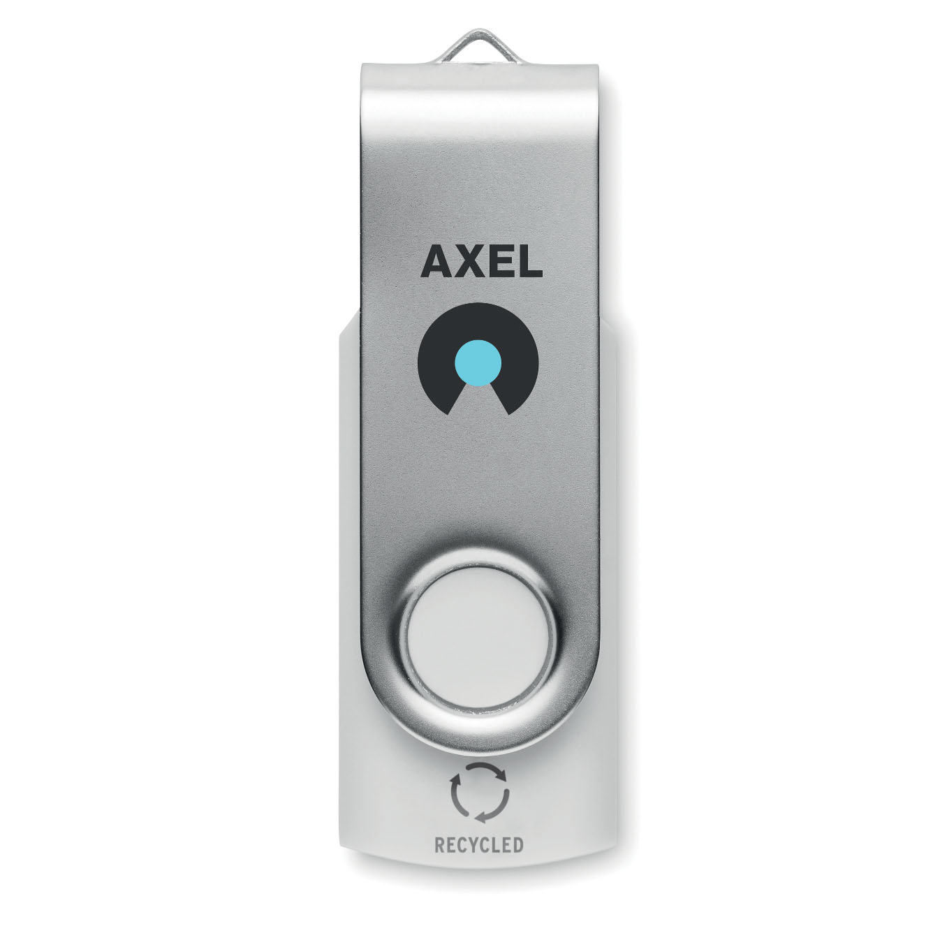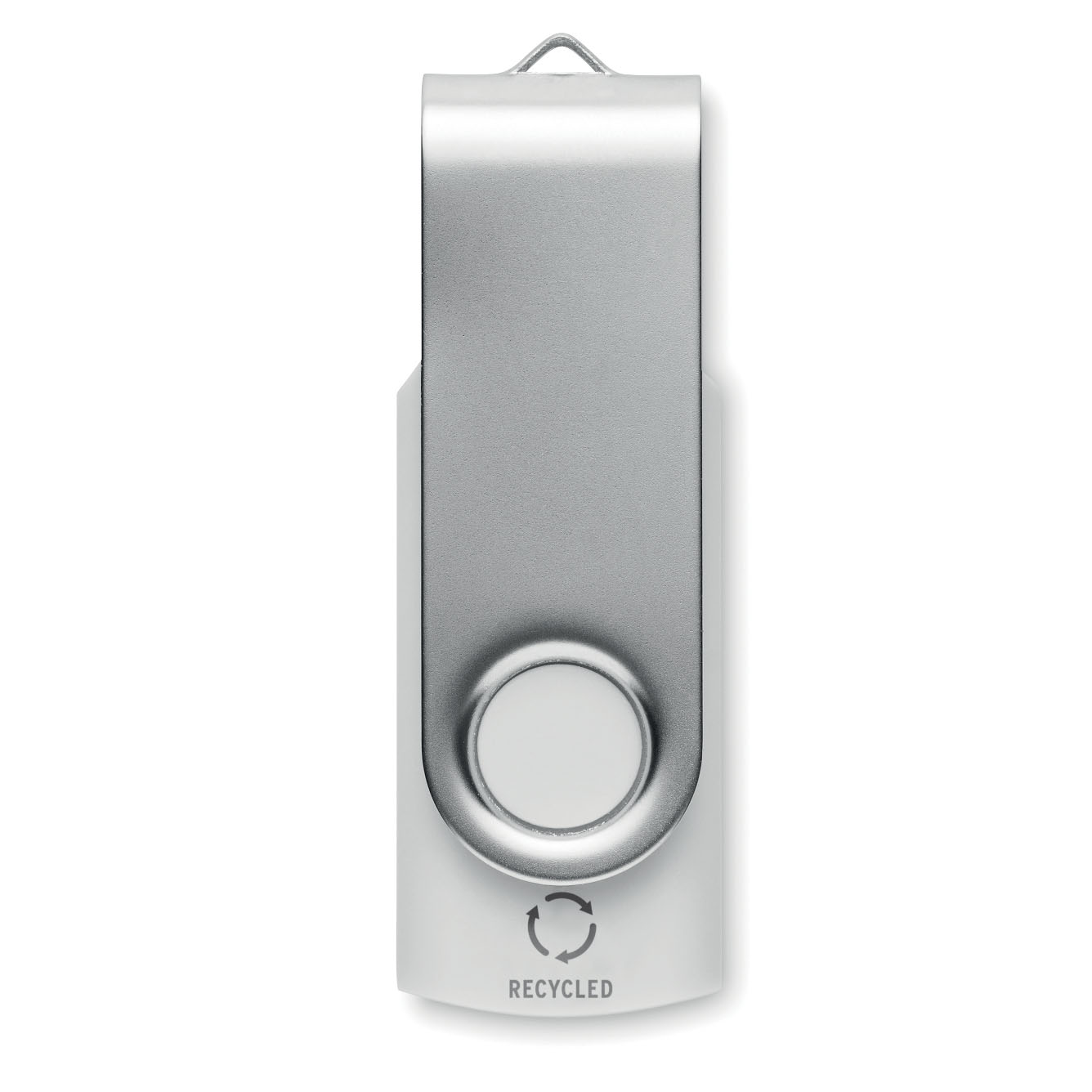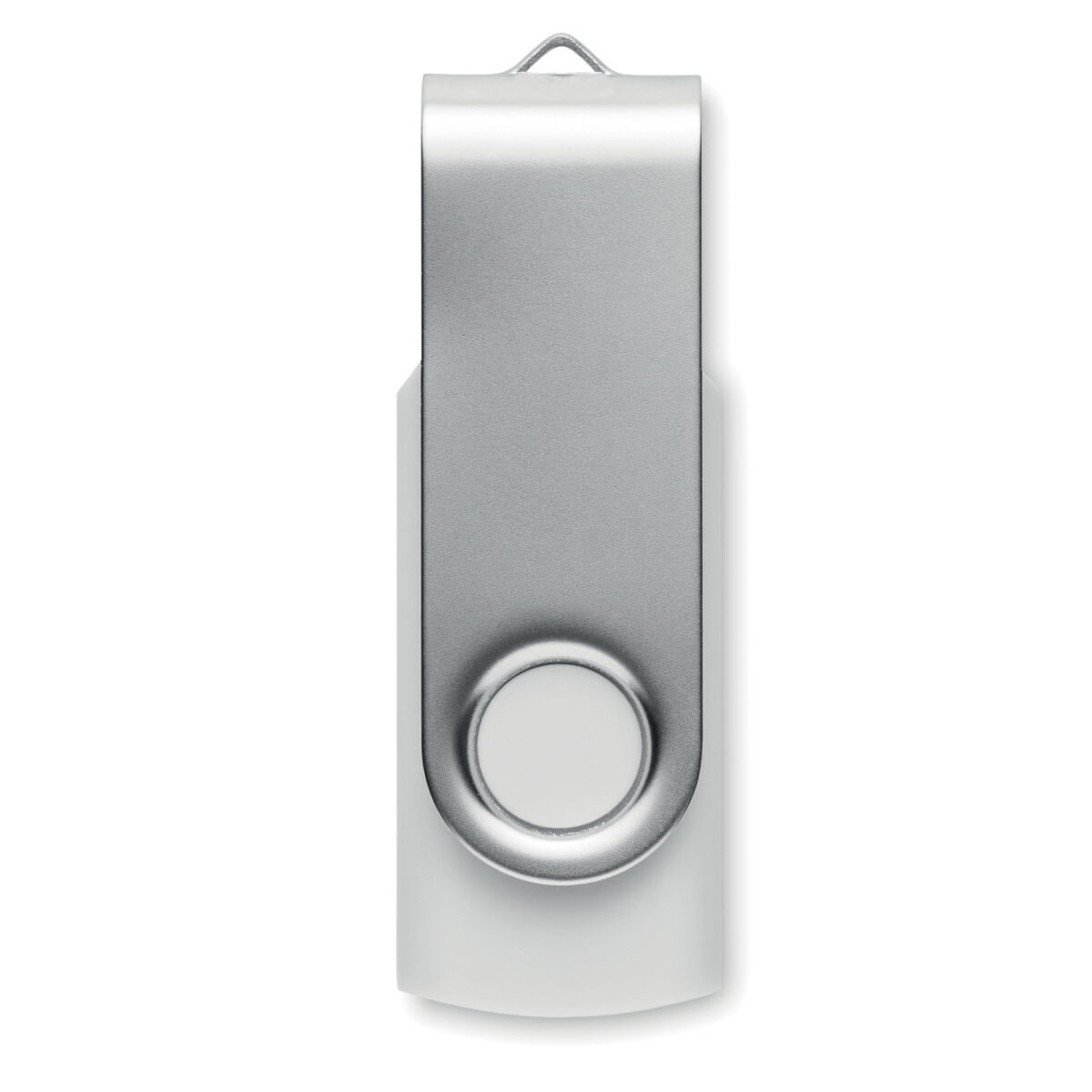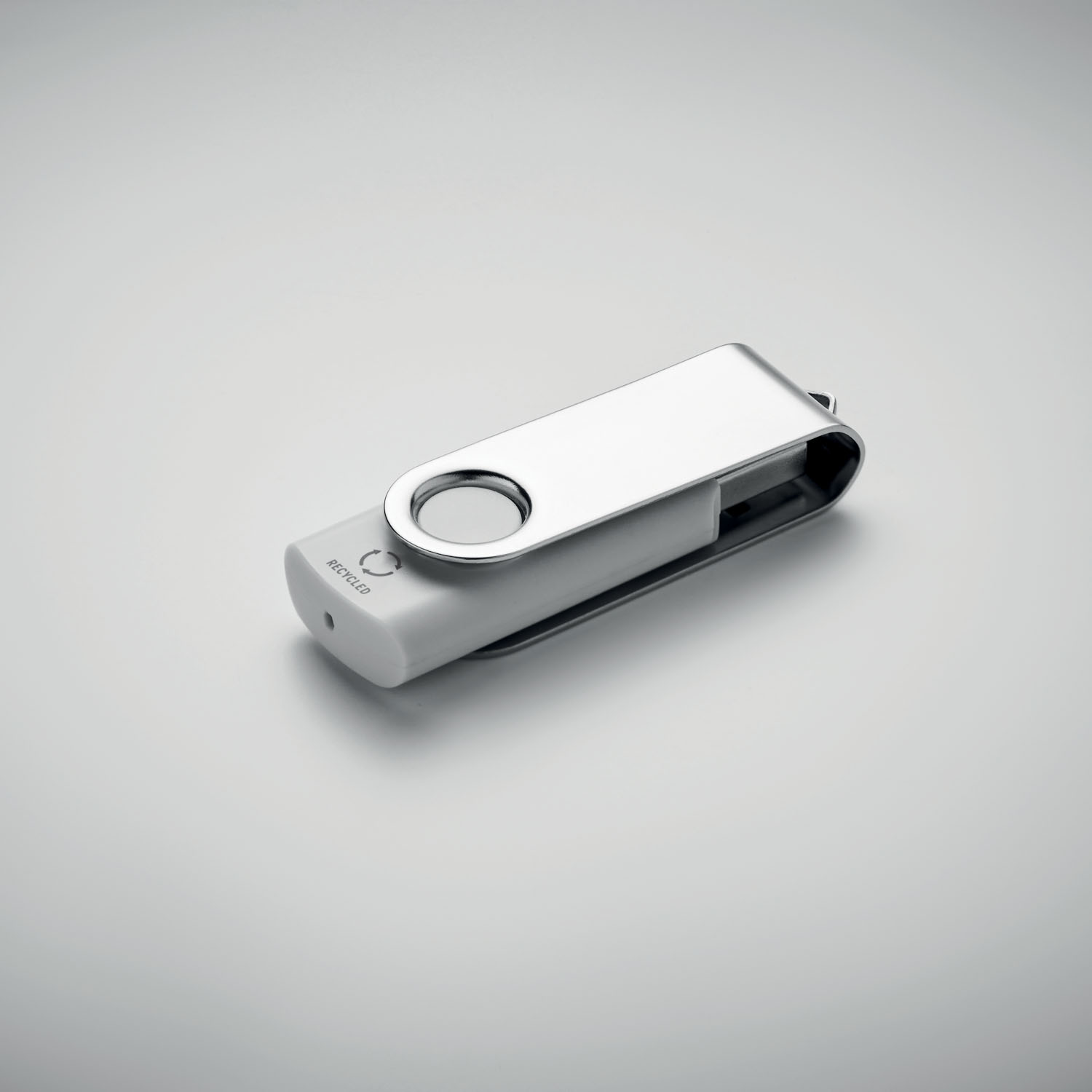 Clé USB 2.0 de 16 Go avec corps en ABS recyclé et finition blanche, munie d’un capot rotatif en métal pour connecter facilement au port USB. Dimensions 5,5 × 1,9 × 1 cm, poids 21 g. Personnalisation disponible en tampographie 1 ou 2 couleurs, gravure laser ou livraison sans personnalisation.