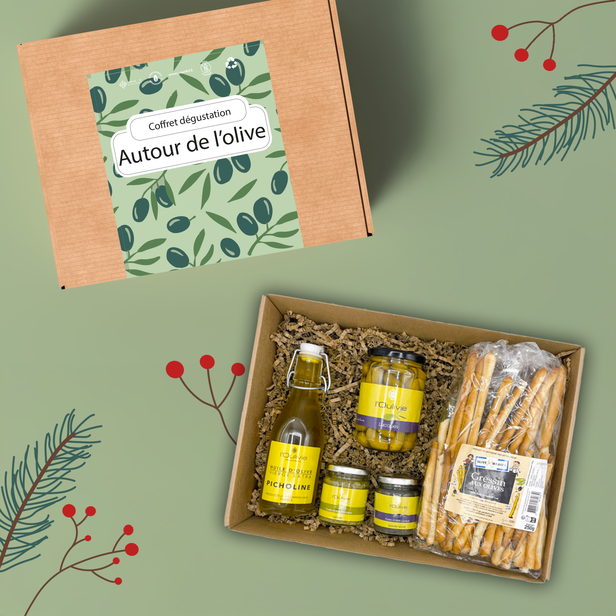 Un coffret gourmand qui célèbre l’olive sous toutes ses formes : olives de table, purées savoureuses, gressins croquants et huile d’olive d’exception.