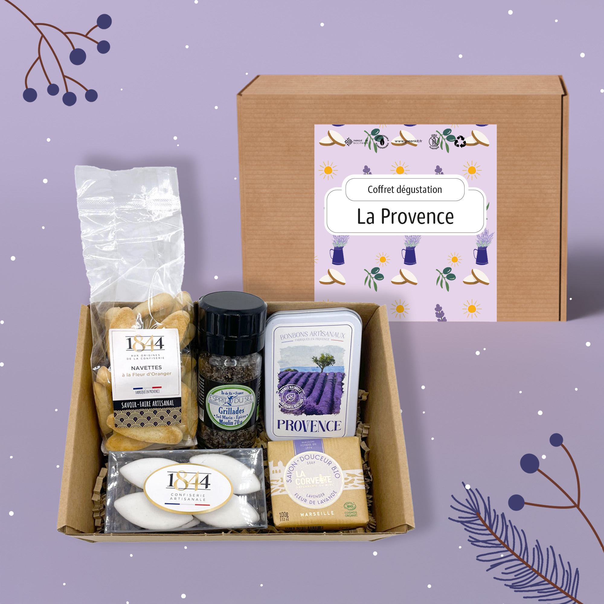 Un coffret parfumé et ensoleillé aux saveurs de Provence : calissons, berlingots, navettes à la fleur d’oranger, sel aux herbes et savon à la lavande.