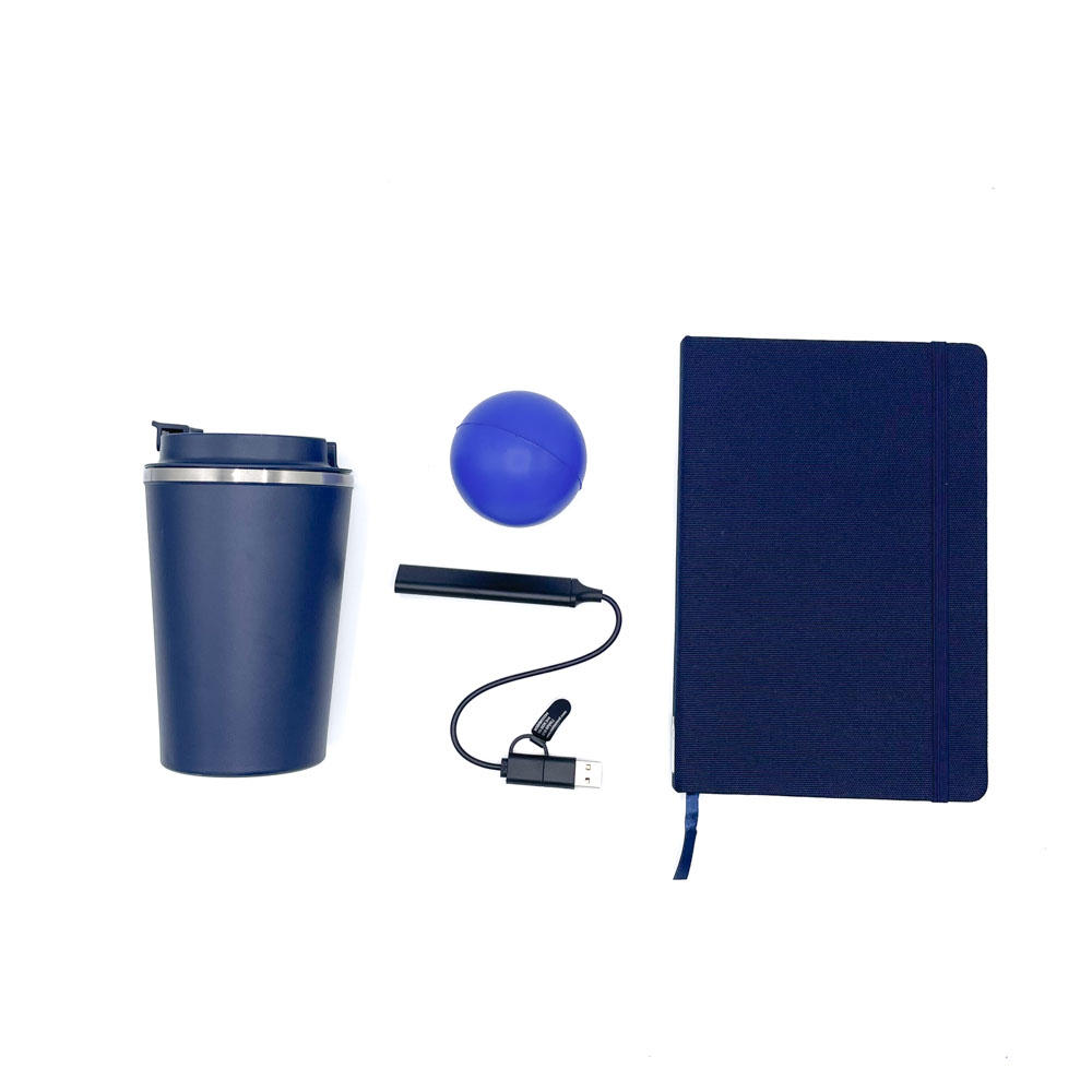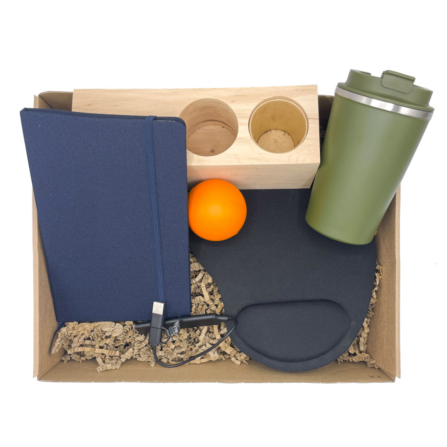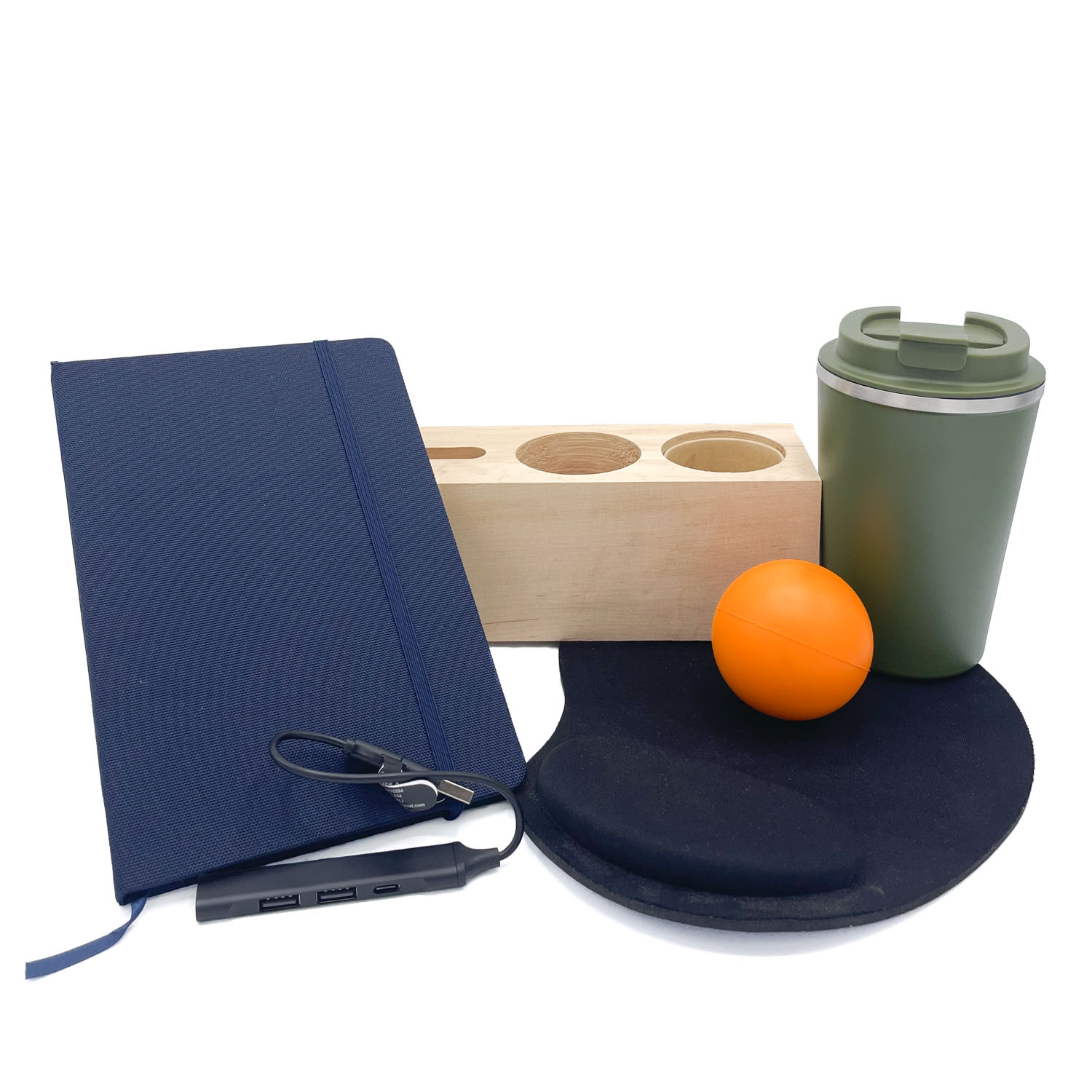 Le coffret est complété par un gobelet en acier inoxydable à double paroi, idéal pour les boissons chaudes ou froides tout au long de la journée, et une balle antistress, pensée pour favoriser les moments de pause et de détente. L’ensemble participe à créer un environnement de travail plus agréable et fonctionnel.