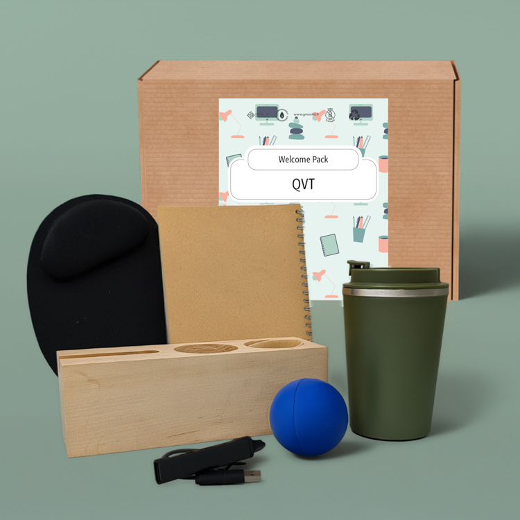 Coffret QVT entreprise dédié à la qualité de vie au travail, composé d’un hub USB à 4 ports en aluminium recyclé, d’un tapis de souris ergonomique, d’un organisateur de bureau, d’un carnet de notes kraft A5 à spirales 48 pages, d’un gobelet en acier inoxydable à double paroi et d’une balle antistress. Personnalisation par gravure laser et tampographie 1 couleur selon les articles, avec zones de marquage adaptées à chaque produit.
