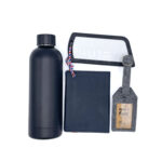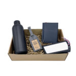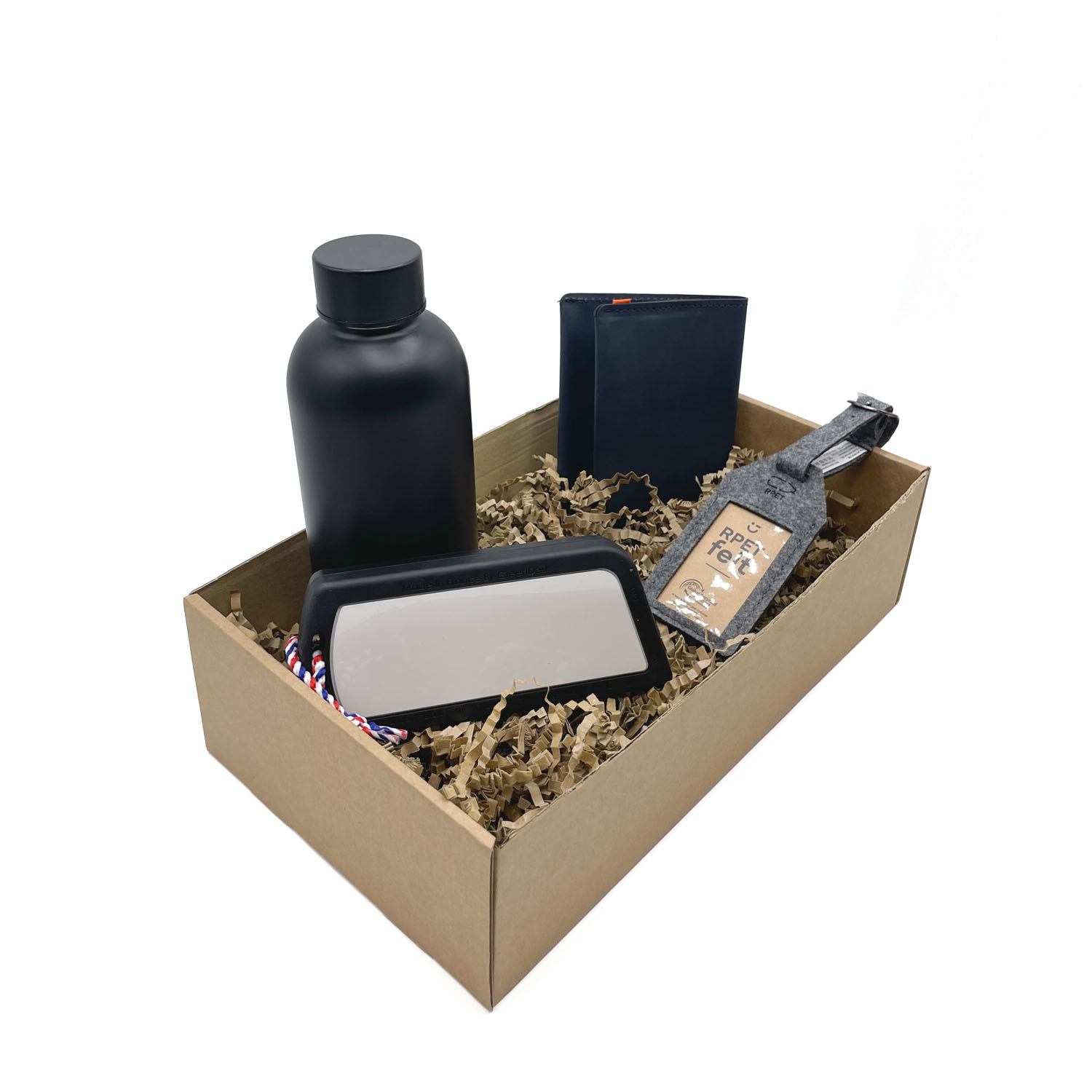 Coffret cadeau entreprise orienté mobilité et voyage, composé d’une batterie externe, d’une gourde isotherme en acier inoxydable 500 ml, d’une étiquette de bagage en feutre recyclé et d’un protège-passeport en cuir recyclé. Personnalisation par impression numérique quadri, impression numérique 360°, sérigraphie 1 couleur et tampographie 1 couleur, selon les articles, avec zones de marquage dédiées à chaque produit.
