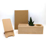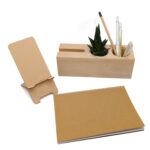 L’ensemble forme une composition cohérente, idéale pour créer un espace de travail plus agréable et organisé. Le choix de matières comme le bois, le papier recyclé et la terre cuite participe à une approche plus responsable, en accord avec des valeurs de durabilité et de bien-être.