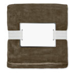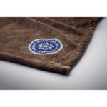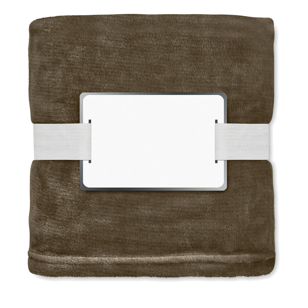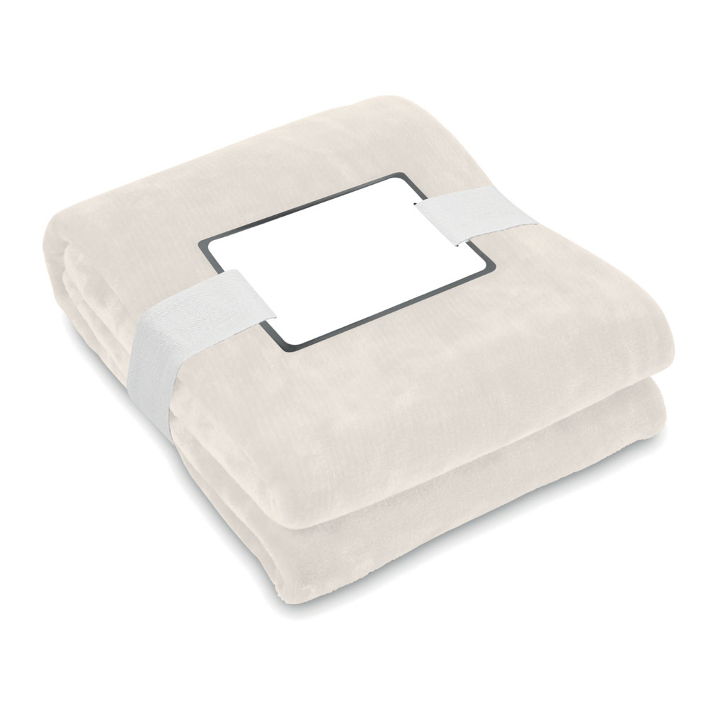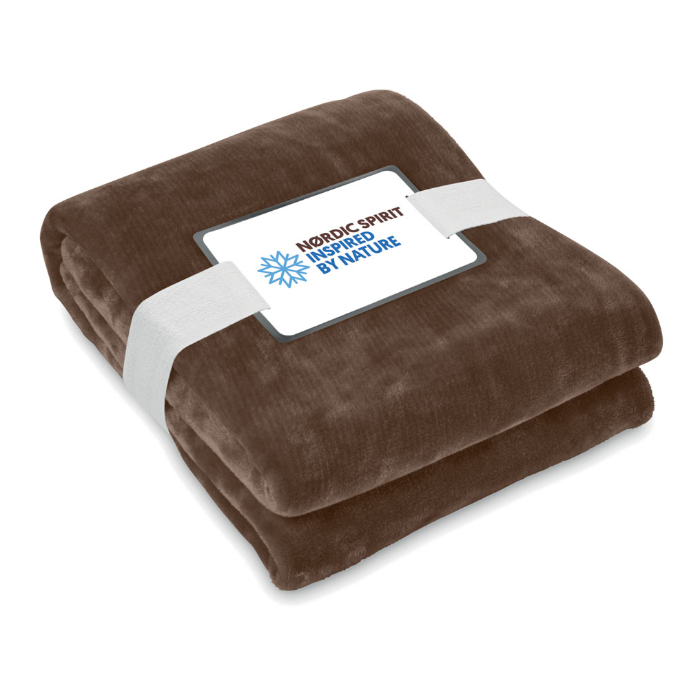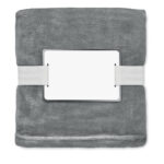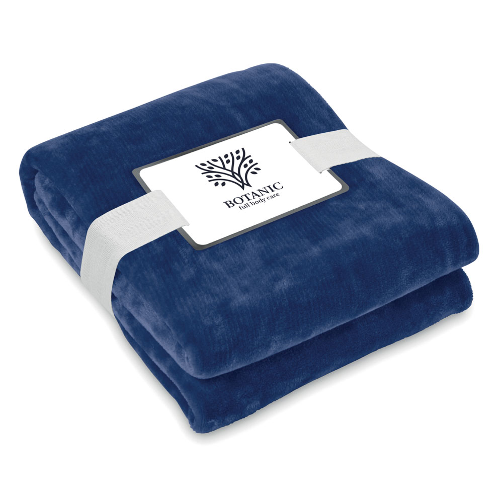 Couverture en polaire flanelle en RPET 280 g/m², dimensions 120 × 150 cm, poids 0,57 kg, enveloppée d’un ruban. Personnalisation possible par broderie sur zone 200 × 200 mm.