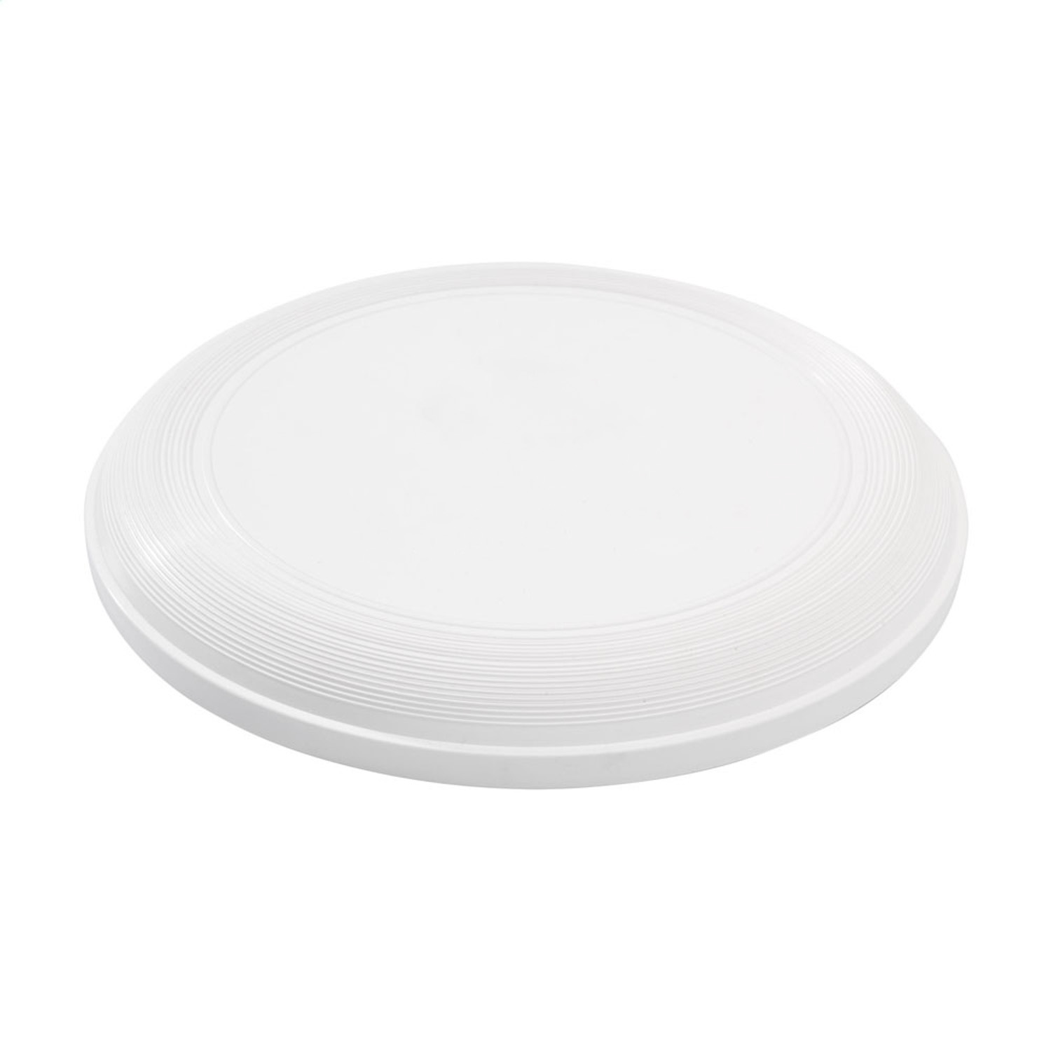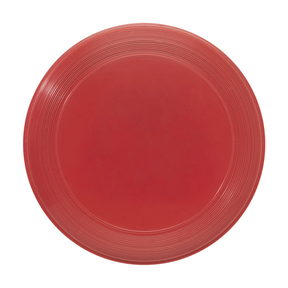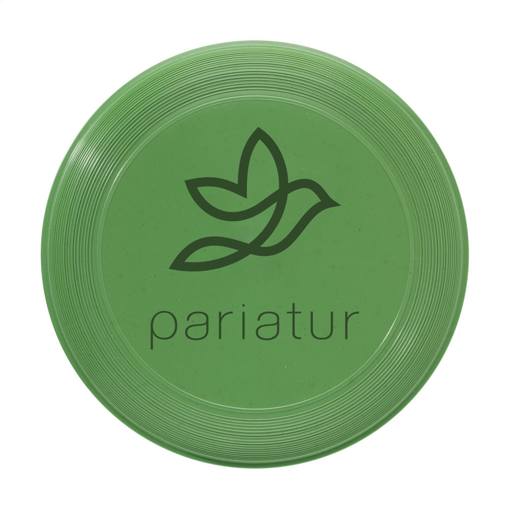 Frisbee en plastique recyclé de 21,5 cm de diamètre, épaisseur 2,5 cm, poids 66 g. Fabriqué à partir de PP recyclé post-consommation issu de déchets électroniques ménagers. Disponible en blanc, bleu ou vert. Personnalisable en sérigraphie 1 couleur. Zone de marquage : Ø115 mm.
