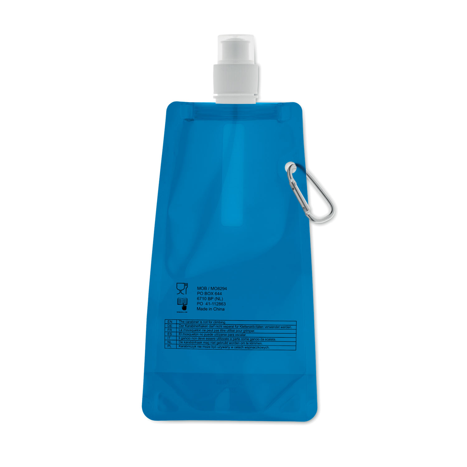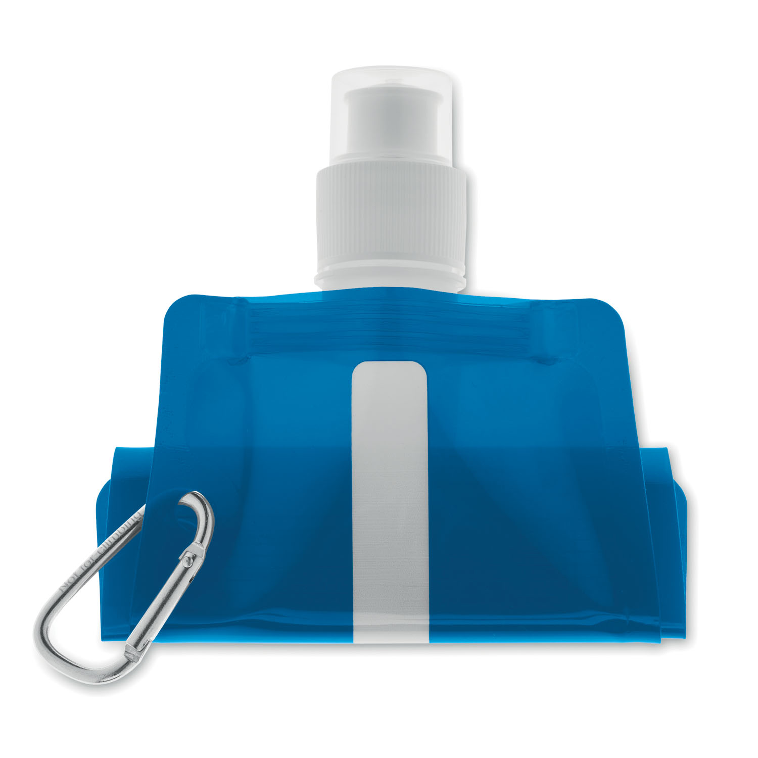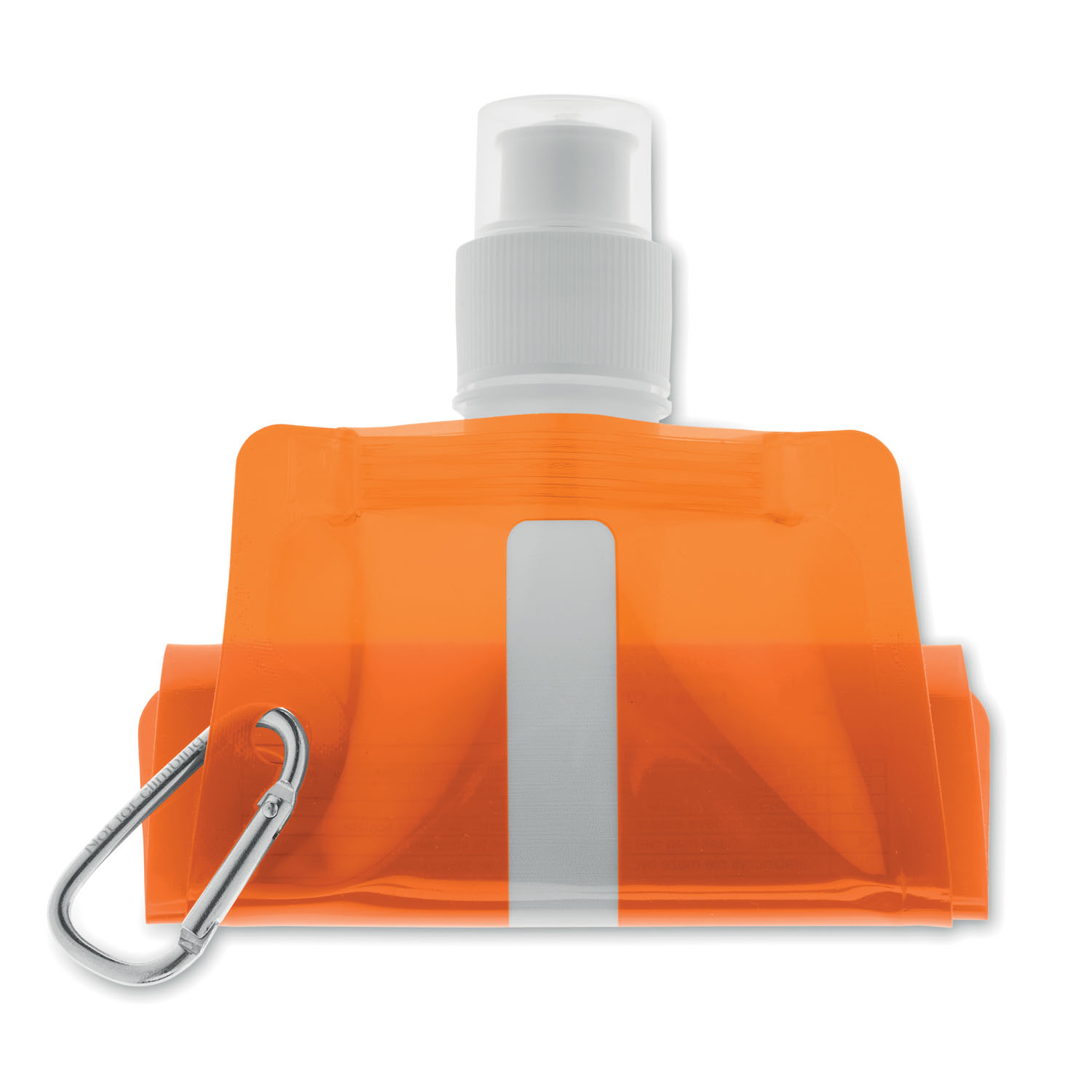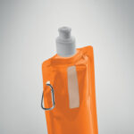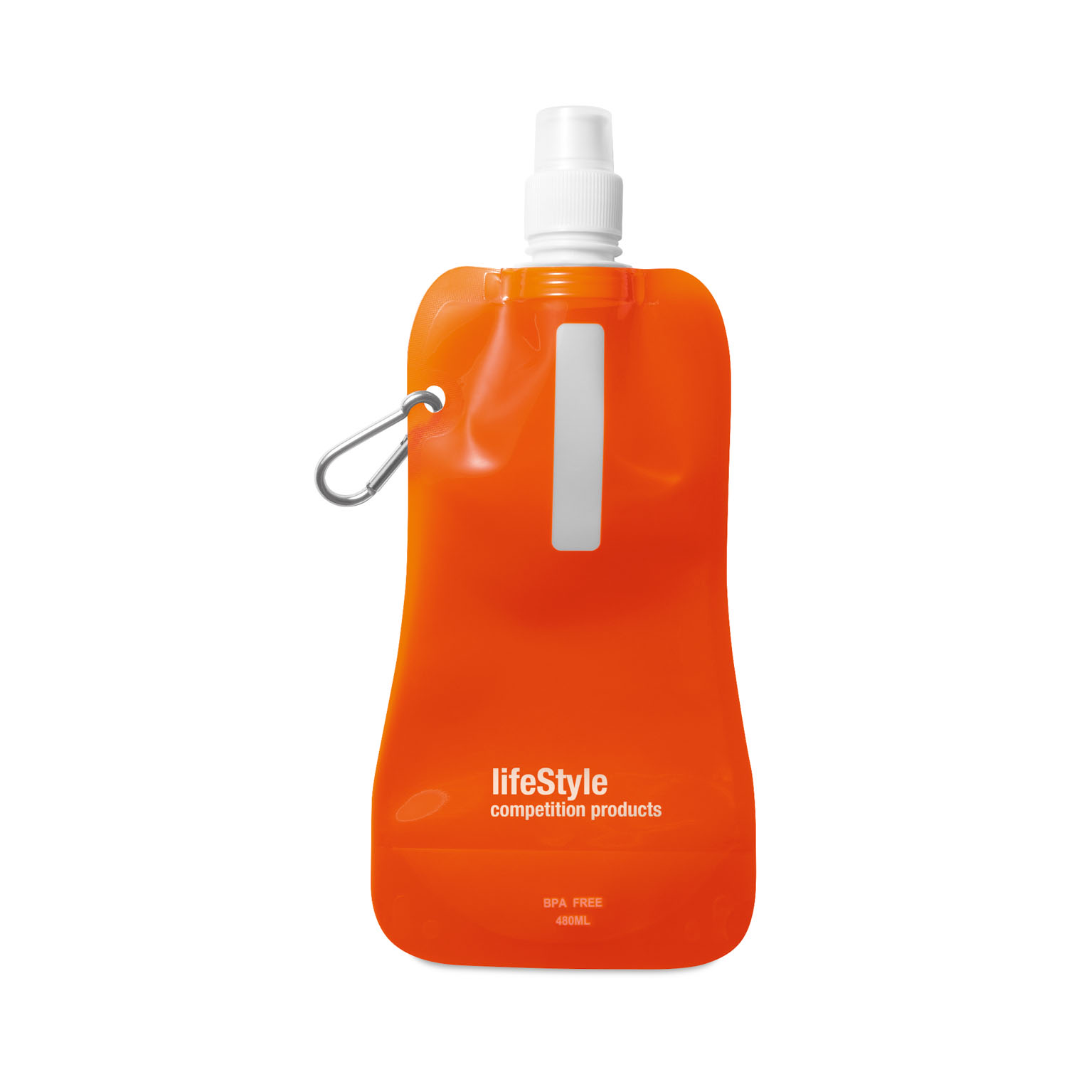 Gourde pliable en PET sans BPA, équipée d’un mousqueton en aluminium, étanche et pratique. Contenance 480 ml, dimensions 12 x 26 cm, poids 0,032 kg. Personnalisation en sérigraphie ou tampographie selon besoins, zones dédiées. Disponible en blanc, bleu, noir, orange, rouge, vert.