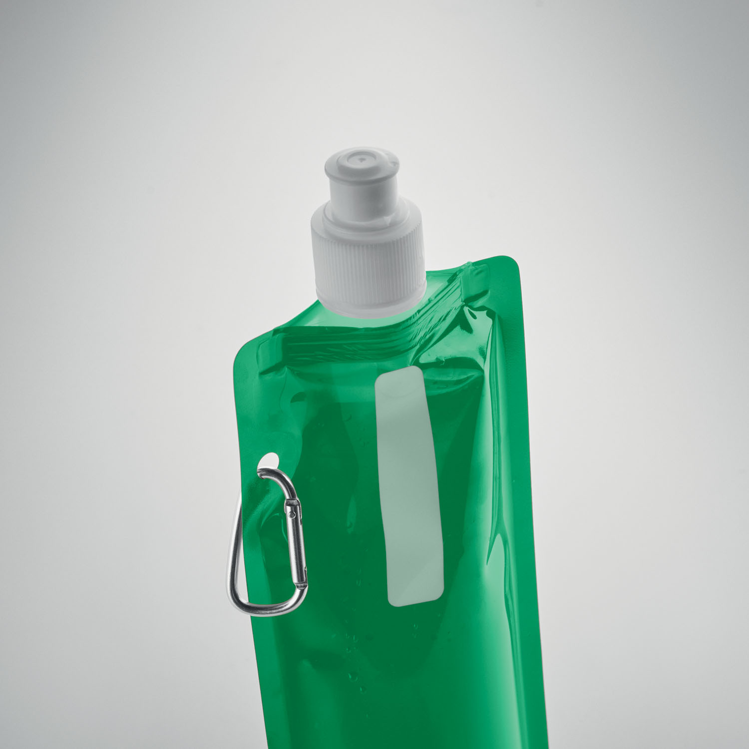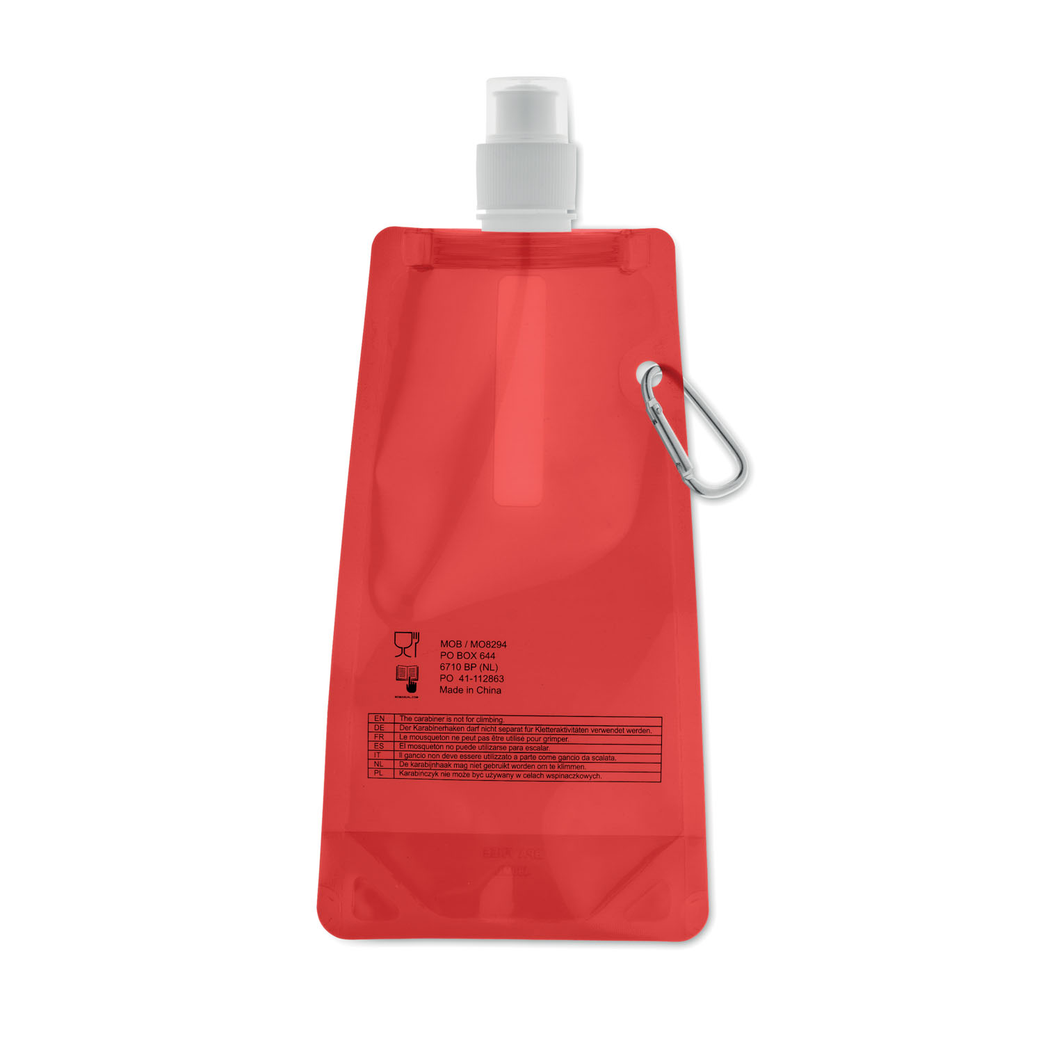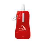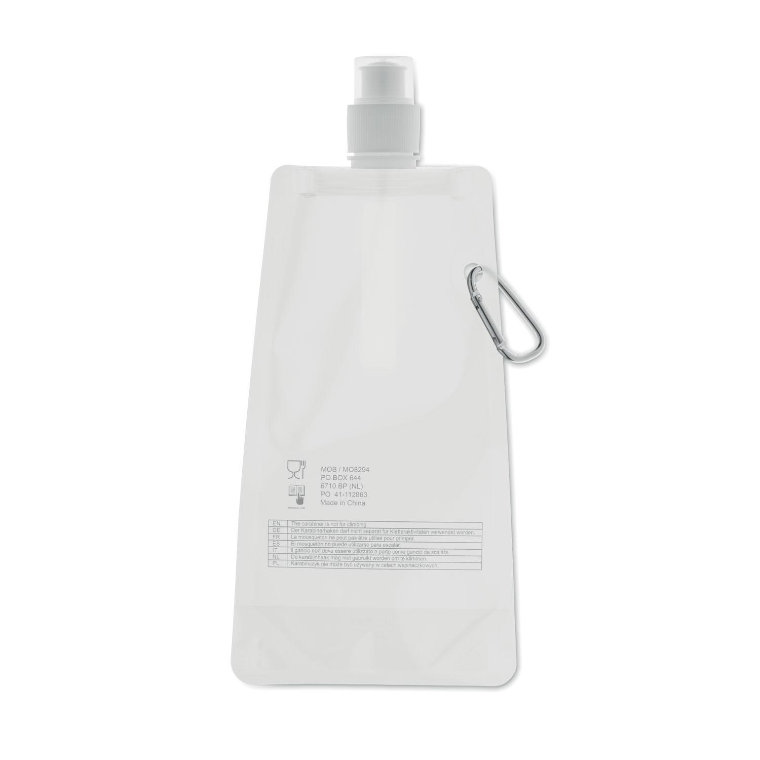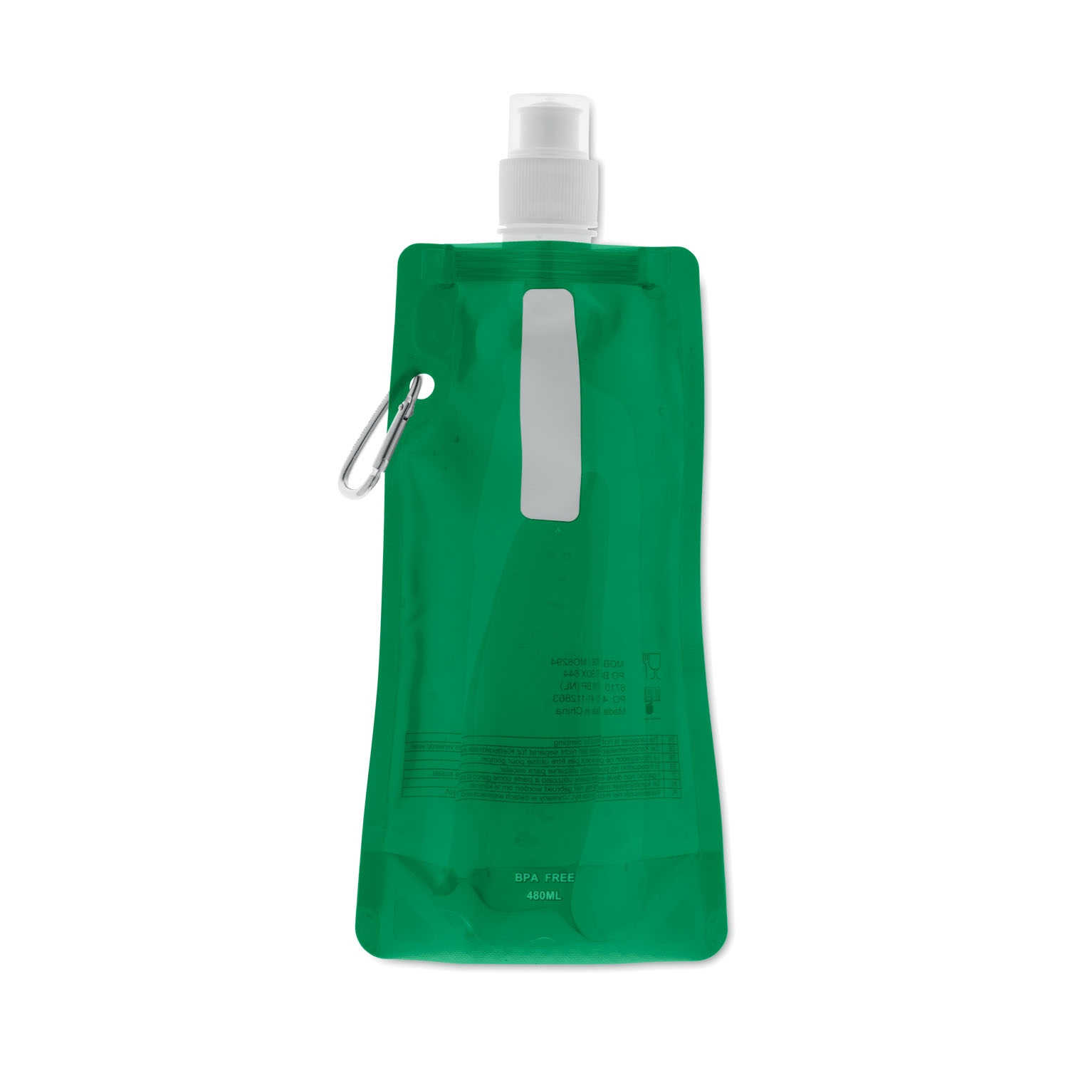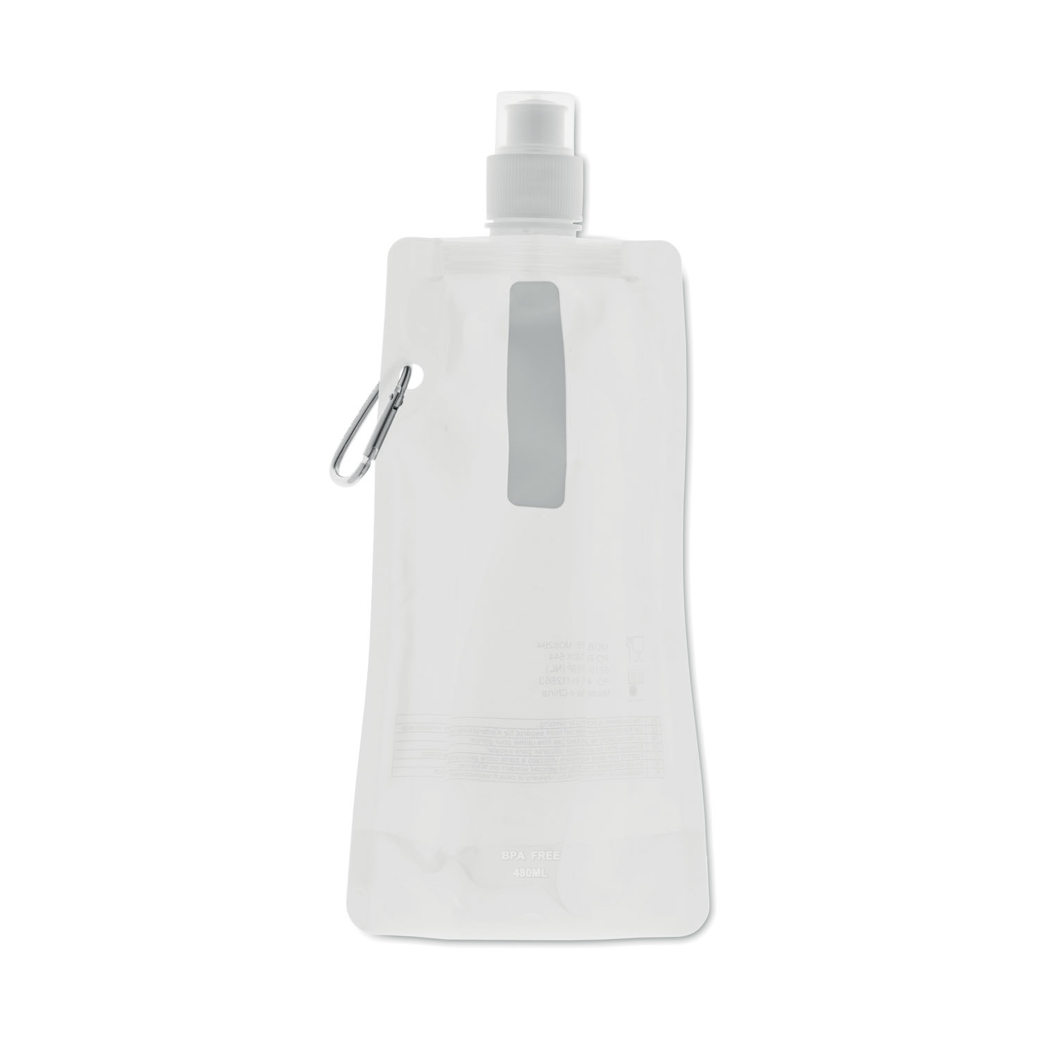 Gourde pliable en PET sans BPA, équipée d’un mousqueton en aluminium, étanche et pratique. Contenance 480 ml, dimensions 12 x 26 cm, poids 0,032 kg. Personnalisation en sérigraphie ou tampographie selon besoins, zones dédiées. Disponible en blanc, bleu, noir, orange, rouge, vert.