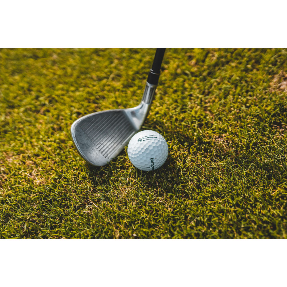 Balles de golf recyclées, kit de 12 unités. Diamètre 4,2 cm, poids total 540 g. Personnalisables en impression quadri avec ou sans nom, Ø 20 mm sur 1 ou 2 faces. Couleur : blanc.