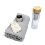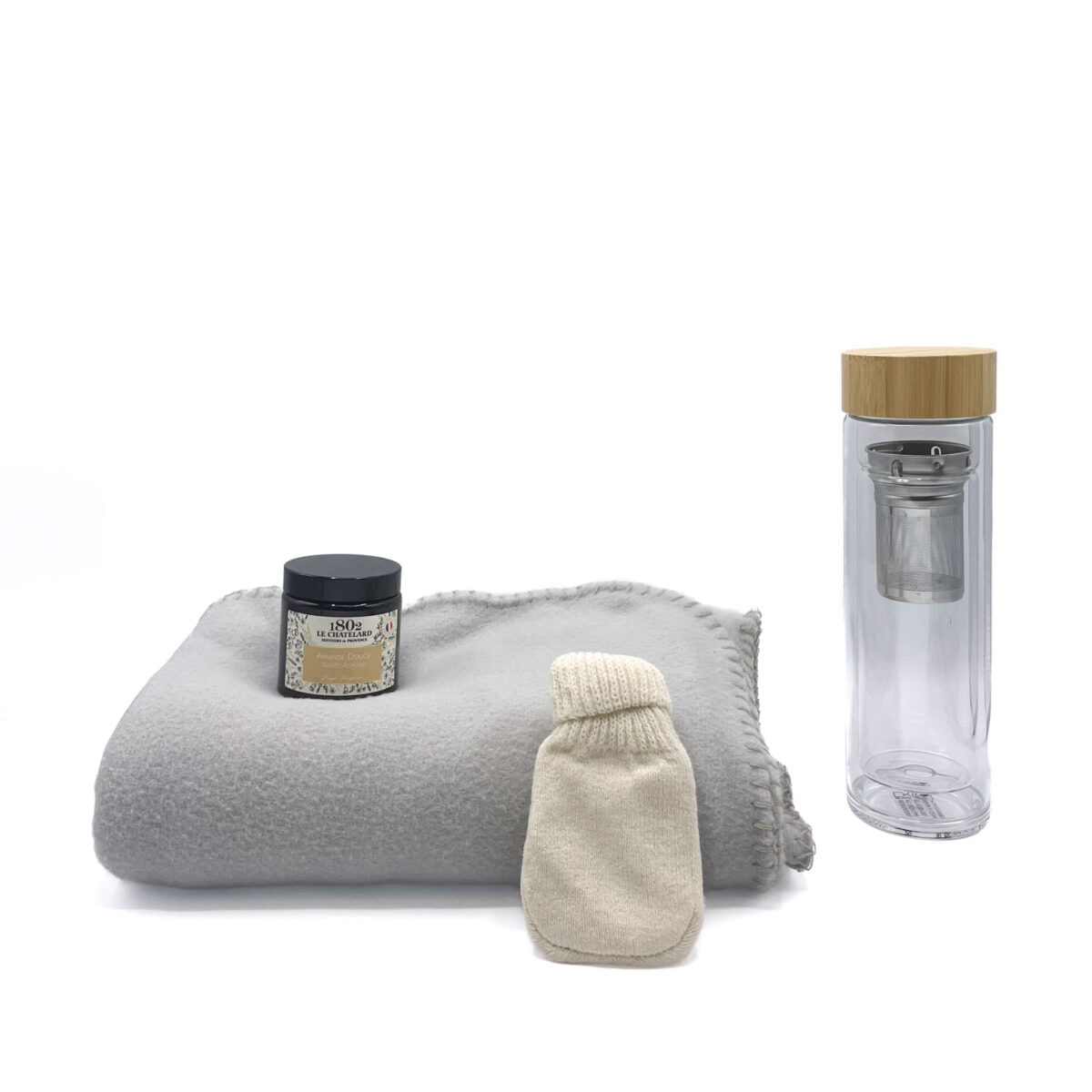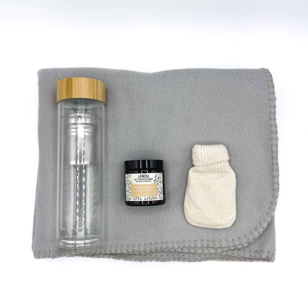 Coffret bien être cocooning pensé pour les welcome packs d’entreprise, composé d’objets dédiés à la détente et au confort. Ensemble prêt à offrir intégrant une couverture polaire en PET recyclé, une bougie made in France parfum amande douce, une chaufferette en polyester tricoté et une gourde en verre avec infuseur à thé. Personnalisation possible par gravure laser, sérigraphie 1 couleur ou transfert numérique quadri, avec zones de marquage prévues selon les produits.