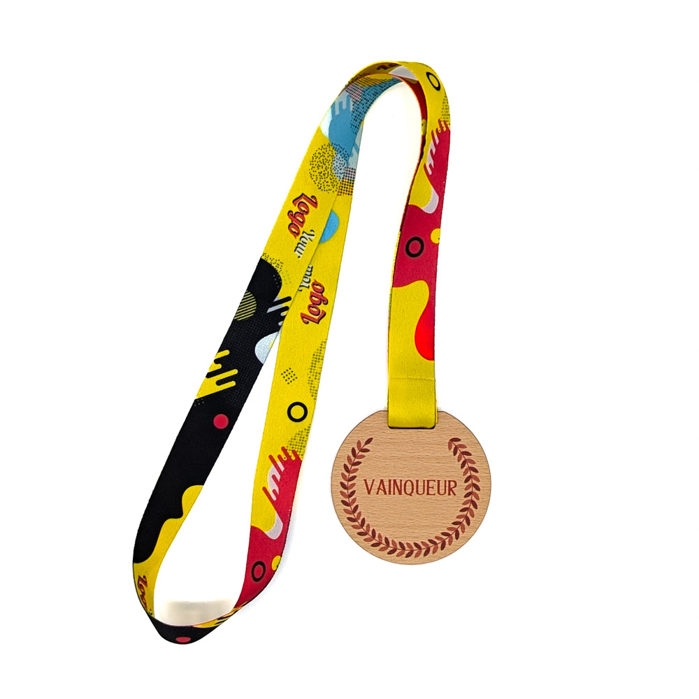 Le tour de cou fourni avec la médaille en bois est fabriqué en RPET, une matière issue du recyclage de bouteilles plastiques. En version non personnalisée, il est proposé avec un fond blanc neutre. Pour une option sur mesure, il peut être personnalisé en sublimation, permettant un fond de couleur intégralement personnalisable. Cette flexibilité en fait un accessoire à la fois responsable et adapté à l’image de l’événement.