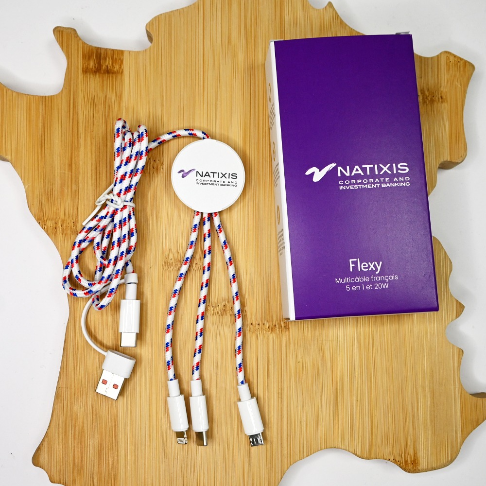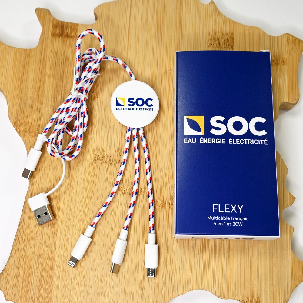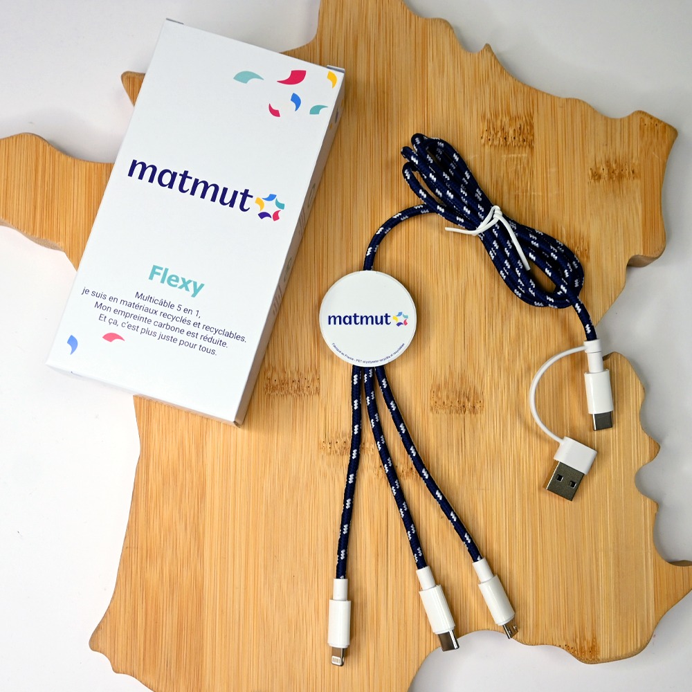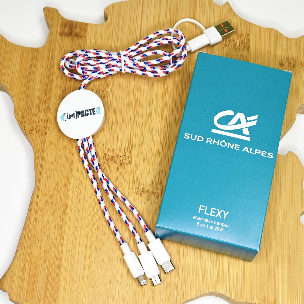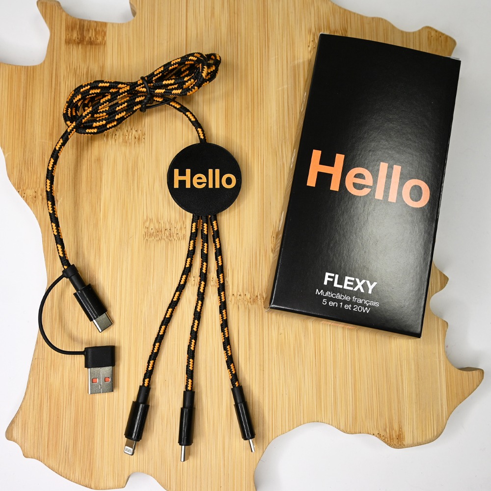 Le Flexy est un multicâble 5-en-1 fabriqué en France avec fast charge 20W, compatible USB-C, Lightning et Micro-USB. Coque en PET recyclé, certification FSC, personnalisable. Idéal pour les professionnels et les cadeaux d’entreprise écologiques.