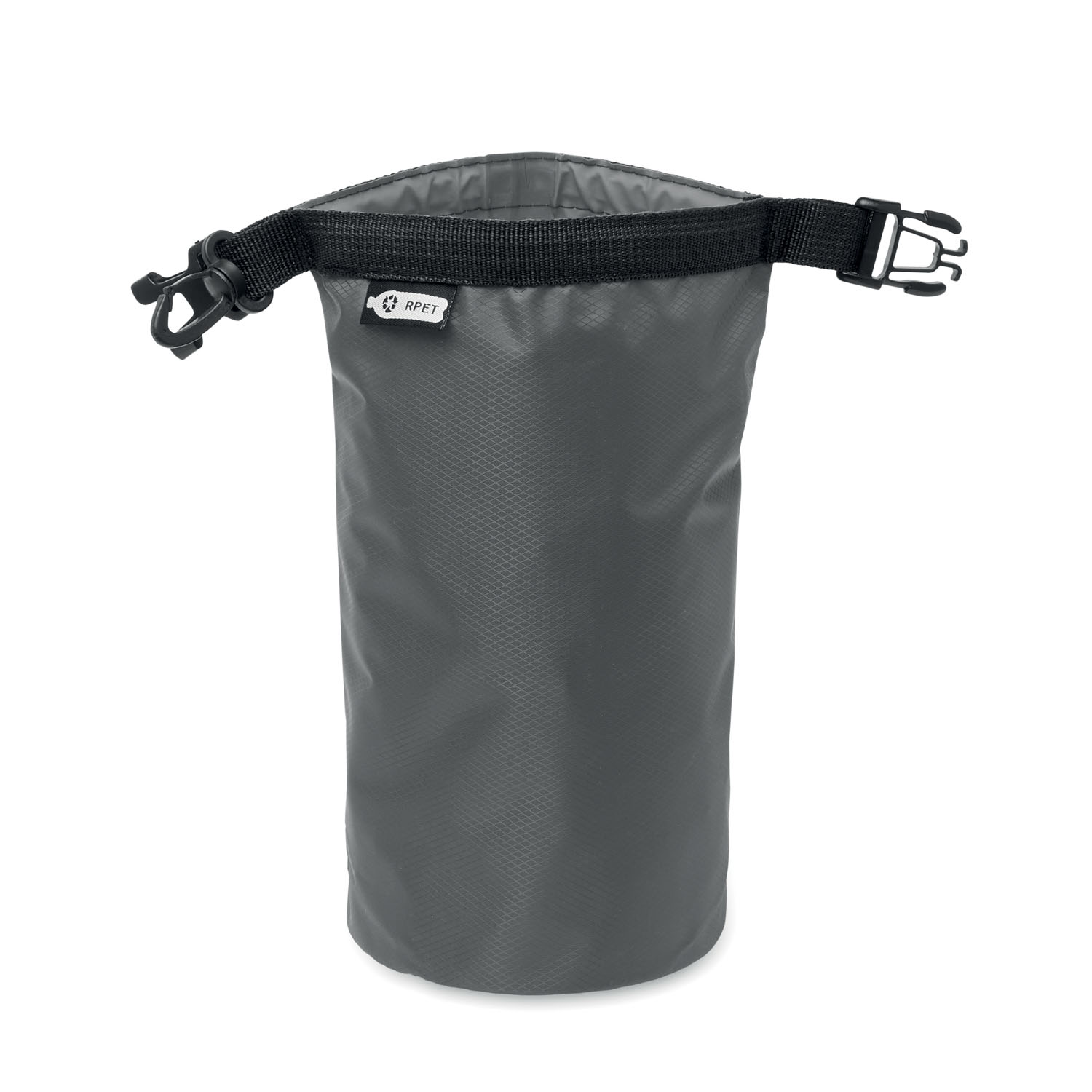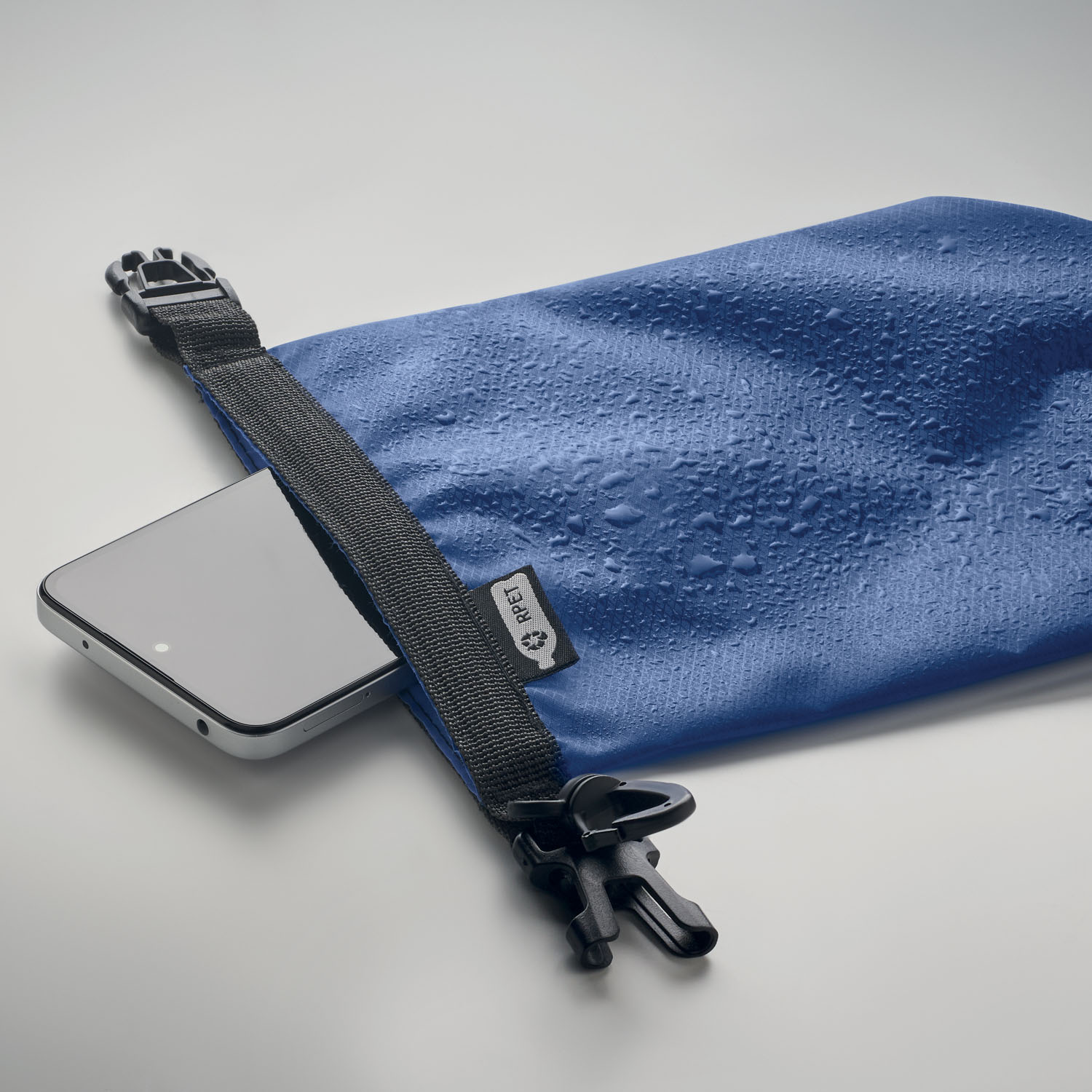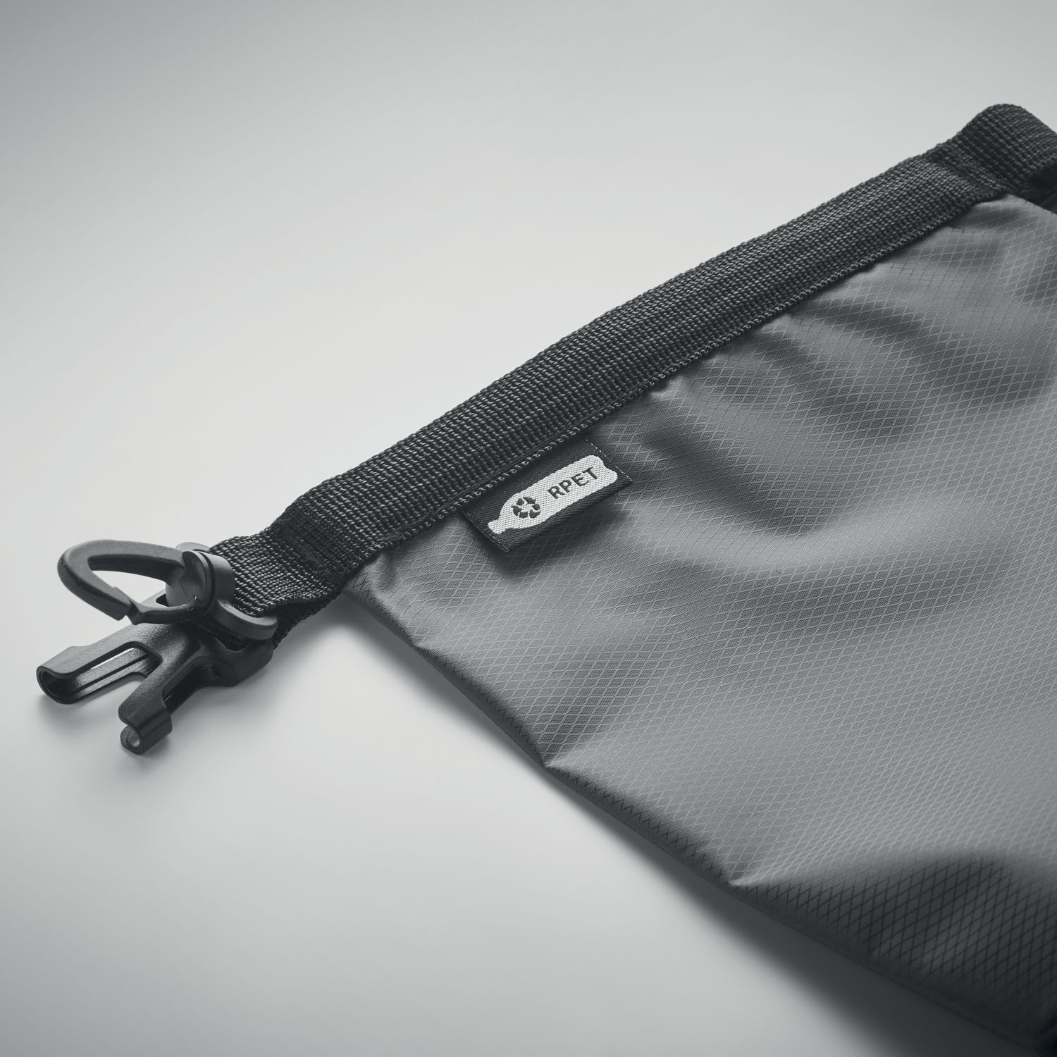 Sac étanche en RPET 210T ripstop IPX6, capacité 1,5 L, format 17,5 × 24,5 cm, poids 0,05 kg. Structure résistante et étanche, idéale pour protéger effets personnels. Personnalisation possible en sérigraphie ou transfert numérique avec zone de marquage dédiée. Disponible en plusieurs coloris.