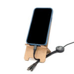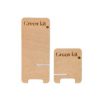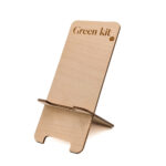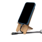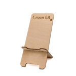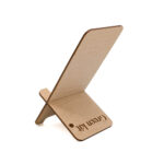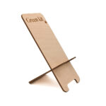Support téléphone en bois de hêtre, dimensions 78 x 180 mm, épaisseur 2,5 mm. Compact et stable. Personnalisable par gravure laser. Zone de marquage : 70 x 100 mm.