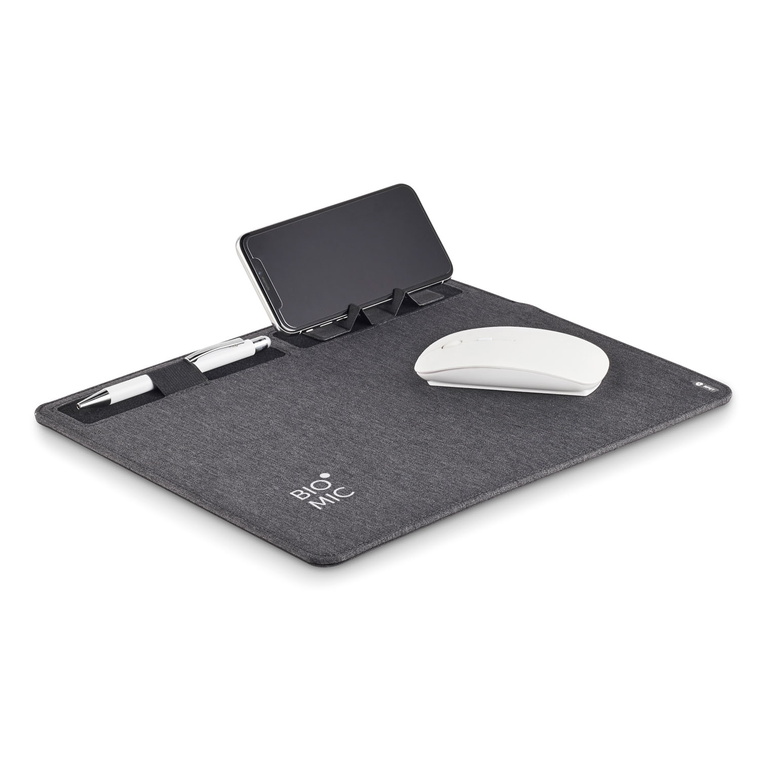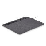 Tapis de souris multifonctionnel en polyester 300D RPET avec chargeur sans fil intégré et support pour téléphone, format 31,5 x 27 x 0,5 cm pour un poids de 355 g. Idéal comme goodie de bureau écoresponsable, il améliore la précision de la souris, protège le bureau et permet de recharger les smartphones compatibles par simple contact. Personnalisation en sérigraphie 1 à 4 couleurs sur une zone de marquage dédiée, ou livraison sans personnalisation.