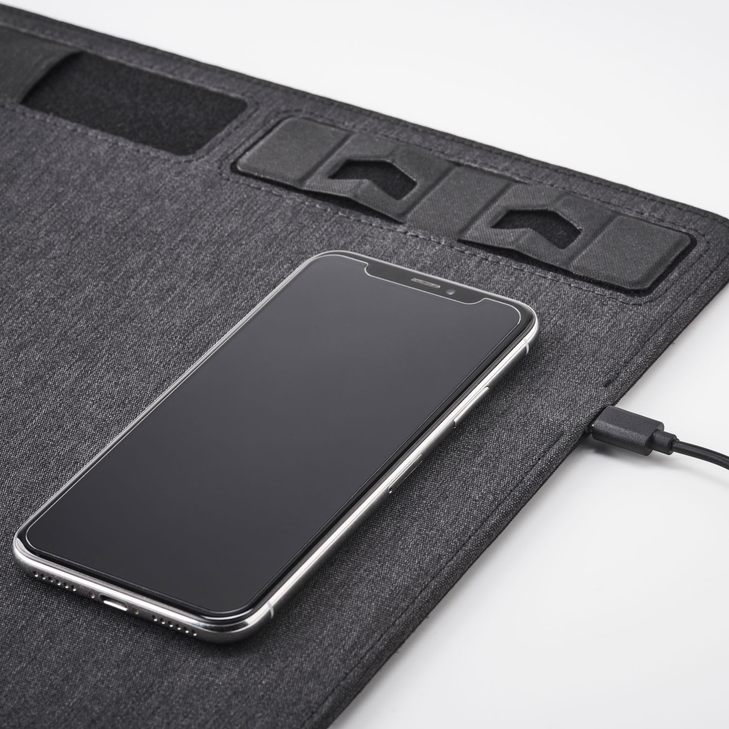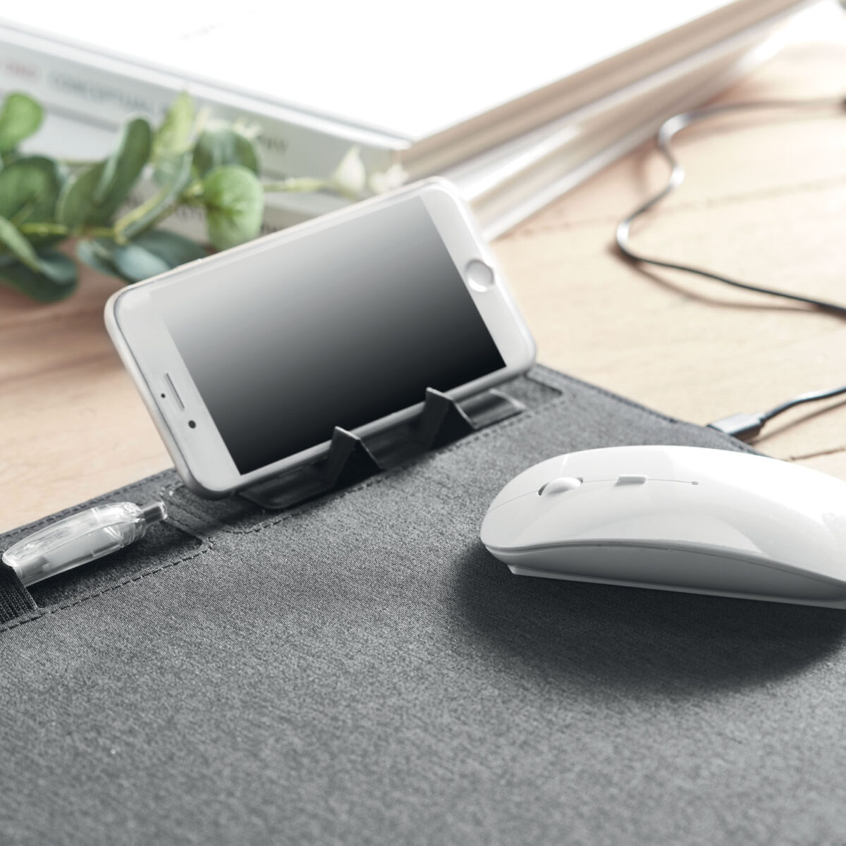 Ce tapis de souris multifonctionnel intègre un chargeur sans fil et un support pour smartphone, pour garder l’écran visible pendant la journée de travail. Il suffit de connecter le tapis à un ordinateur ou à un adaptateur secteur pour alimenter la zone de charge, puis de poser le téléphone compatible sur le tapis pour lancer la recharge par simple contact. Cet accessoire 2-en-1 trouve naturellement sa place dans un environnement de télétravail, un open-space ou un espace d’accueil, et devient un goodie high-tech apprécié et utilisé au quotidien.